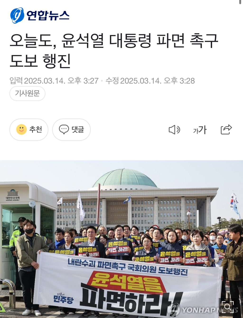 [여시뉴스데스크]오늘도, 윤석열 대통령 파면 촉구 도보 행진 작성자뽀스타|작성시간25.03.14|조회수941 목록 댓글 2 글자크기 작게가 글자크기 크게가 출처: https://n.news.naver.com/article/001/0015266159?sid=100오늘도, 윤석열 대통령 파면 촉구 도보 행진윤석열 대통령 파면 촉구 도보 행진에 참여한 국회의원들이 14일 서울 여의도 국회에서 광화문을 향해 출발하고 있다. 2025.3.14n.news.naver.comㅅㅂ 조뺑이는 민주당이랑 1찍들이 ㅈㄴ하는중문제 시 뭐요 다음검색 현재 게시글 추가 기능 열기 북마크 공유하기 신고 센터로 신고 댓글 댓글 2 댓글쓰기 답글쓰기 댓글 리스트 작성자하꼬랑이 | 작성시간 25.03.14 광화문에서 만나유..ㅠㅠ 작성자사랑아망곰해 | 작성시간 25.03.14 당장 선고되고 승리의 행진이 되었음 좋겠다ㅠ 댓글 전체보기