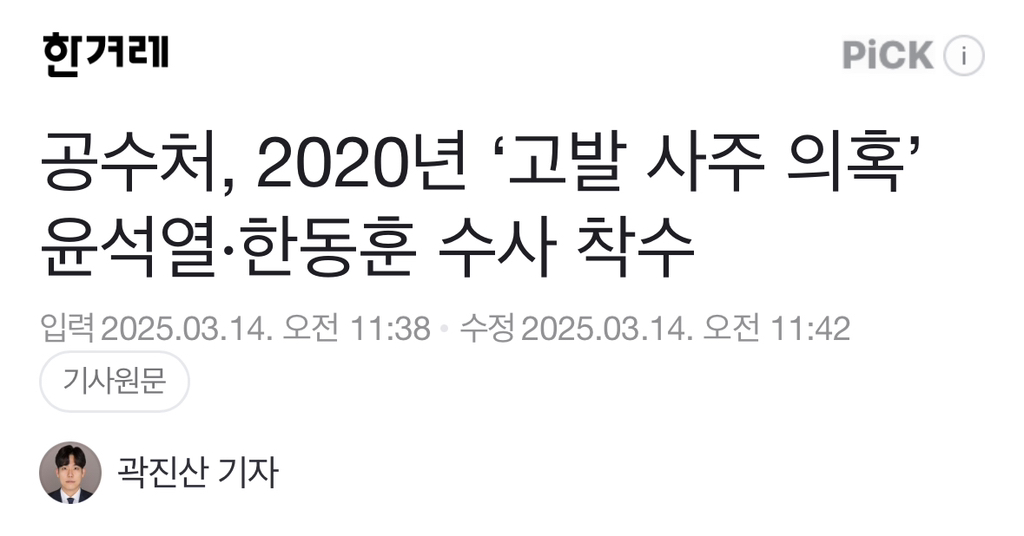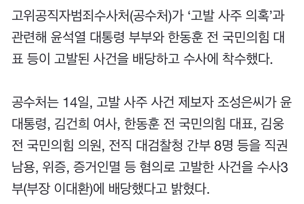 [여시뉴스데스크]공수처, 2020년 ‘고발 사주 의혹’ 윤석열·한동훈 수사 착수 작성자소리앙|작성시간25.03.14|조회수953 목록 댓글 20 글자크기 작게가 글자크기 크게가 출처: https://naver.me/F3Tcy0Sb공수처, 2020년 ‘고발 사주 의혹’ 윤석열·한동훈 수사 착수고위공직자범죄수사처(공수처)가 ‘고발 사주 의혹’과 관련해 윤석열 대통령 부부와 한동훈 전 국민의힘 대표 등이 고발된 사건을 배당하고 수사에 착수했다. 공수처는 14일, 고발 사주 사건 n.news.naver.com전문출처 다음검색 현재 게시글 추가 기능 열기 북마크 공유하기 신고 센터로 신고 댓글 댓글 20 댓글쓰기 답글쓰기 댓글 리스트 작성자큭피 | 작성시간 25.03.14 굿굿 일 잘하네 ~~ 작성자헤르쯔 아날로그 | 작성시간 25.03.14 ㅎㅇㅌ 작성자친구 목록을 초기화 합니다. | 작성시간 25.03.14 잘하다! 작성자아는것만나와라 | 작성시간 25.03.14 이시대 최고의 공수처장 오동운!!! 작성자내란수괴윤석열사형 | 작성시간 25.03.14 공수처 잘한다 파이팅 댓글 전체보기