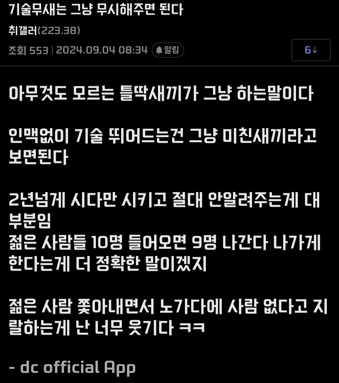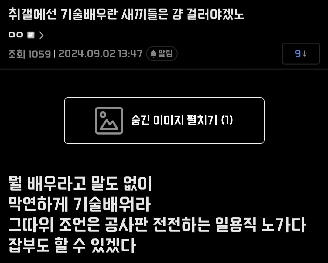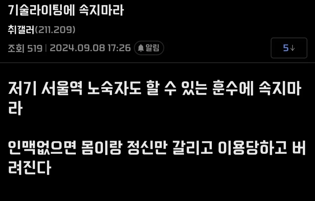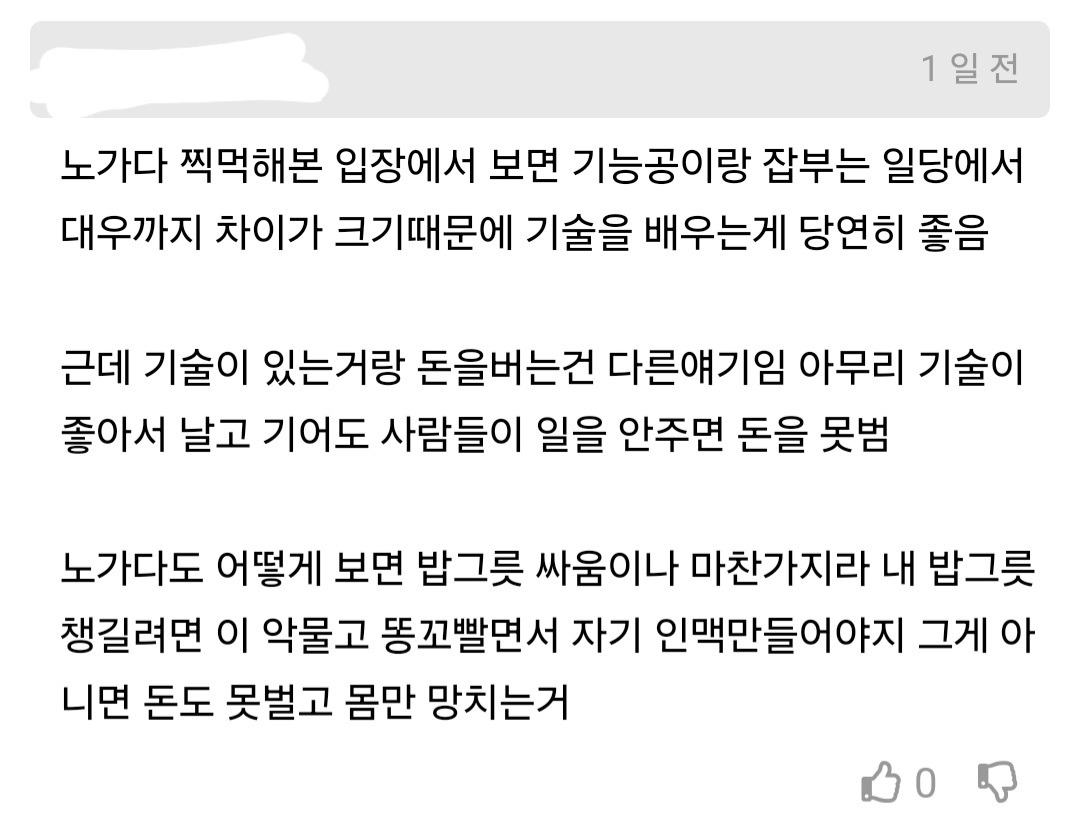 작성자펴나나 작성시간 25.03.14 그냥 맞말... 기술직은 다 인맥이야 아예 채용공고 자체를 안내버리는 기술직들이 얼마나 많게요ㅠ 다 지인 꽂음.. 메인 몇명 부르면 시다도 알아서 꽂힘.. 이게 시간을 돈으로 바꾸는 작업이라 첨 본 손 타기도 그렇고.. 채용공고로 늘 채워지는 기술직이면 기술직 아니라 생각.. 그건 좀만 알면 할 수 있는 초보적인 기술직일들.. 포항 지진때 포스코만 봐도 알 수 있음.. 공고는 그저 형식이고 실력없고 팀없고 인맥없으면 밥도 안주고 내쫒음 인건비가 도라벌여서