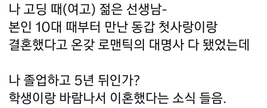 작성자milishake 작성시간 25.03.15 제자 졸업하자마자 결혼한 남선생있었는데...