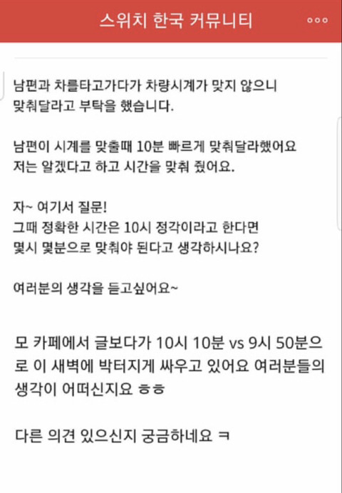 [흥미돋]답이 극명하게 갈리는 10시 10분 vs 9시 50분 작성자250314|작성시간25.03.14|조회수9,649 목록 댓글 165 글자크기 작게가 글자크기 크게가 출처: https://cafe.daum.net/subdued20club/ReHf/2667260답이 극명하게 갈리는 10시 10분 vs 9시 50분당연히 9시 50분이지 했는데 주변사람들한테 물어보니 진짜 극과극으로 갈림ㅋㅋ출처 짤속에cafe.daum.net 당연히 10시 10분이지 했는데 주변사람들한테 물어보니 진짜 극과극으로 갈림ㅋㅋ 다음검색 현재 게시글 추가 기능 열기 북마크 공유하기 신고 센터로 신고 댓글 댓글 165 댓글쓰기 답글쓰기 댓글 리스트 작성자오빤키도작으면서 | 작성시간 25.03.14 정각이면 10시 10분아니여?! 작성자프로야 | 작성시간 25.03.14 알람이 아니니까 10시 10분 작성자장래희망물개 | 작성시간 25.03.14 시간이 찐으로 10시라는 가정하에 시계가 10시 10분을 향해야 “저 시계는 10분 빨라!” 라고 말하잖아 그러니까 10시 10분이지ㅋㅋ 작성자메아아 | 작성시간 25.03.14 단순히 10분 빠르게 보고싶다는 걸로 9:50 작성자디즈애스터 | 작성시간 25.03.15 이게 2일수가 있나 댓글 전체보기