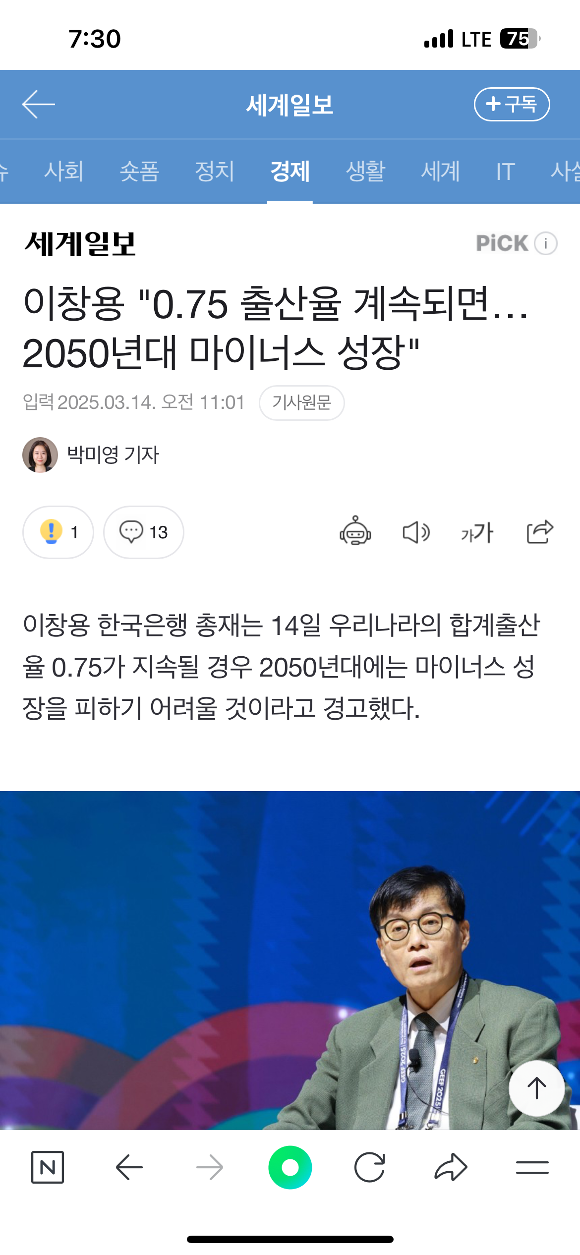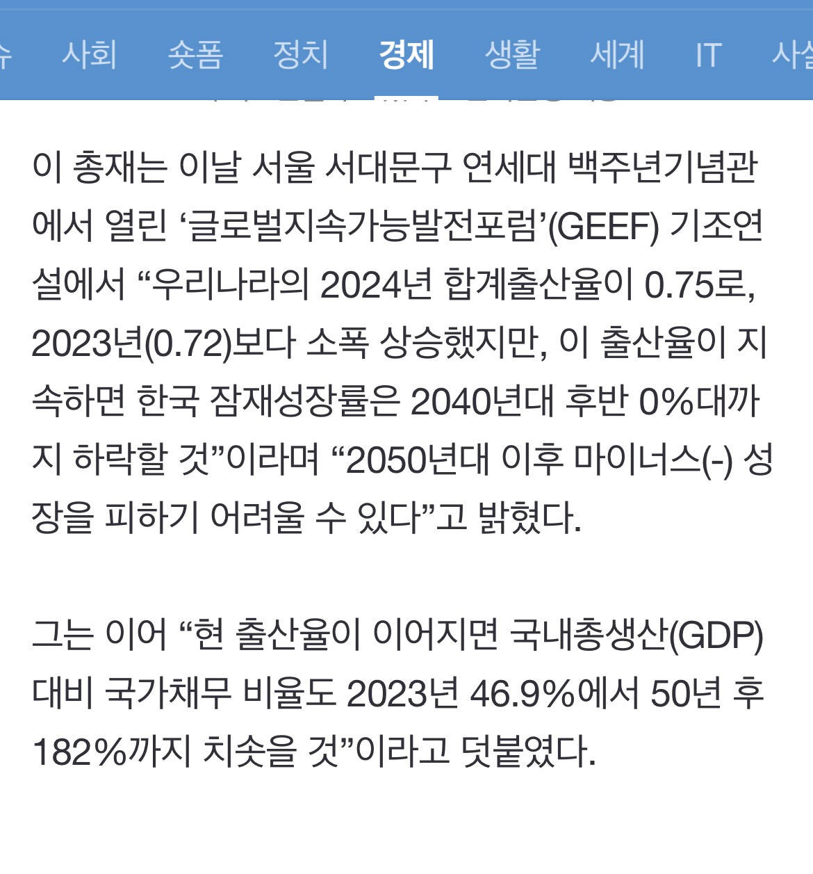 [여시뉴스데스크]이창용 "0.75 출산율 계속되면… 2050년대 마이너스 성장" 작성자울트라사운드|작성시간25.03.14|조회수1,672 목록 댓글 28 글자크기 작게가 글자크기 크게가 출처: https://n.news.naver.com/article/022/0004018948?sid=101후략 전문은 출처에 다음검색 현재 게시글 추가 기능 열기 북마크 공유하기 신고 센터로 신고 댓글 댓글 28 댓글쓰기 답글쓰기 댓글 리스트 작성자당근에스컬레이터 | 작성시간 25.03.15 과연 애를 안 낳아서 이지경이 된걸까요? 작성자춘식짱 | 작성시간 25.03.15 과연 25년이나 지나서일까요~~~???^^ 작성자뚱캔비타민 | 작성시간 25.03.15 양극화를 해소하든지 작성자리사심슨! | 작성시간 25.03.15 나라를 살리려고 애를 낳으라는게 안 통하는 시대인 거부터 받아들이시길 작성자엉망진창딸케 | 작성시간 25.03.15 누가 해결해줘 겁만주고 뭐암것도안하는듯 댓글 전체보기