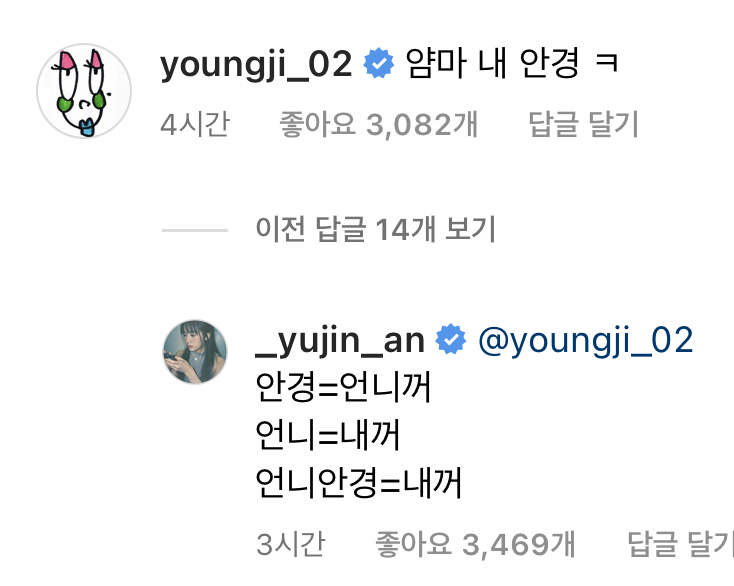 [스크랩] [흥미돋]안경=언니꺼 언니=내꺼 언니안경=내꺼 작성자신비로운너의모습|작성시간25.03.14|조회수23,012 목록 댓글 19 글자크기 작게가 글자크기 크게가 출처 : 여성시대 X file아이브 유진이랑 영지 대화 다음검색 스크랩 원문 : *여성시대* 차분한 20대들의 알흠다운 공간 현재 게시글 추가 기능 열기 북마크 공유하기 신고 센터로 신고 댓글 댓글 19 댓글쓰기 답글쓰기 댓글 리스트 작성자도태되지말고탈출하자 | 작성시간 25.03.14 왐마 연하란 작성자낭만가을 | 작성시간 25.03.14 ㄱㅇㅇㅋㅋㅋㅋㅋㅋㅋㅋㅋㅋ 작성자웬디 | 작성시간 25.03.14 ㄱㅇㅇ 작성자PIN3 | 작성시간 25.03.15 귀여워 ㅋㅋㅋㅋㅋ 작성자보라색맛 | 작성시간 25.03.15 아귀여워 댓글 전체보기