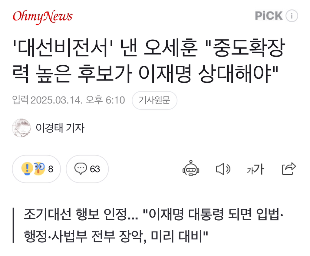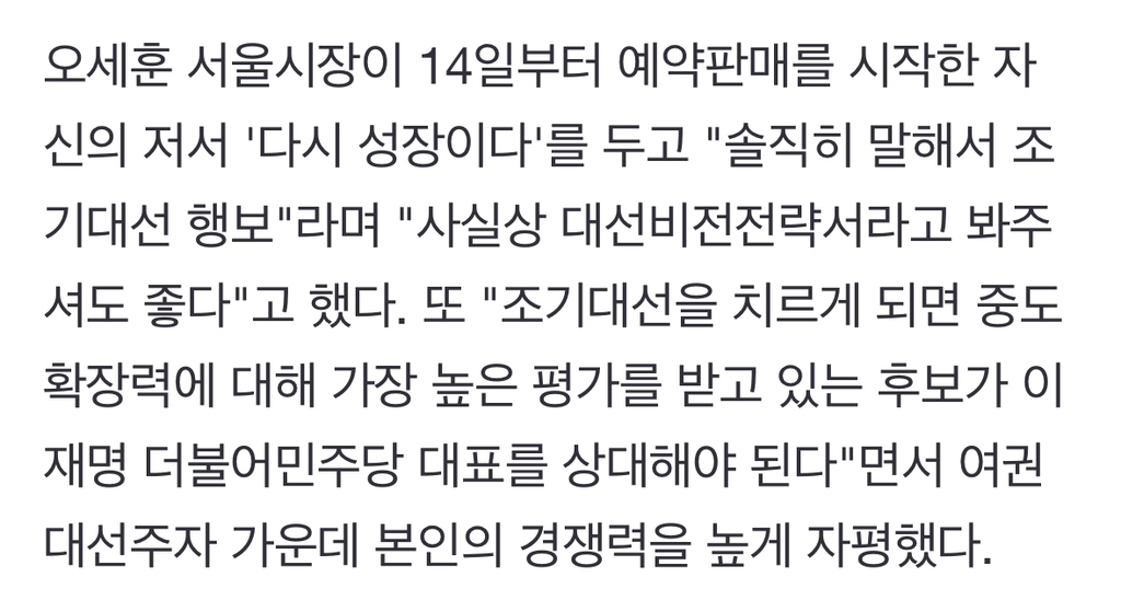 [여시뉴스데스크]'대선비전서' 낸 오세훈 "중도확장력 높은 후보가 이재명 상대해야" 작성자소리앙|작성시간25.03.14|조회수524 목록 댓글 7 글자크기 작게가 글자크기 크게가 출처: https://naver.me/GG7vIGL7'대선비전서' 낸 오세훈 "중도확장력 높은 후보가 이재명 상대해야"▲ 오세훈 서울시장이 14일 남영동 주민센터에서 발급받은 모바일 주민등록증을 보여주고 있다. 2025.3.14 ⓒ 서울시 제공 오세훈 서울시장이 14일부터 예약판매를 시작한 자신의 저서 '다시 성장n.news.naver.com전문출처 다음검색 현재 게시글 추가 기능 열기 북마크 공유하기 신고 센터로 신고 댓글 댓글 7 댓글쓰기 답글쓰기 댓글 리스트 작성자나락도rock이다 | 작성시간 25.03.14 아 그게 본인이라고 생각하는 거..? 풉 작성자성악설 | 작성시간 25.03.14 뭐래 작성자국민의힘 지역구에서 소비X 불매 | 작성시간 25.03.14 당신은 아니에요... 작성자타낵타낵타낵타 | 작성시간 25.03.14 자의식과잉 작성자밤으로의 긴 여로 | 작성시간 25.03.14 명태균은 어쩌고 ㅋ 댓글 전체보기