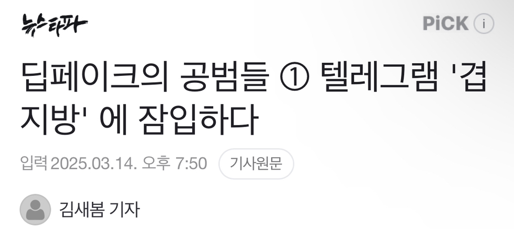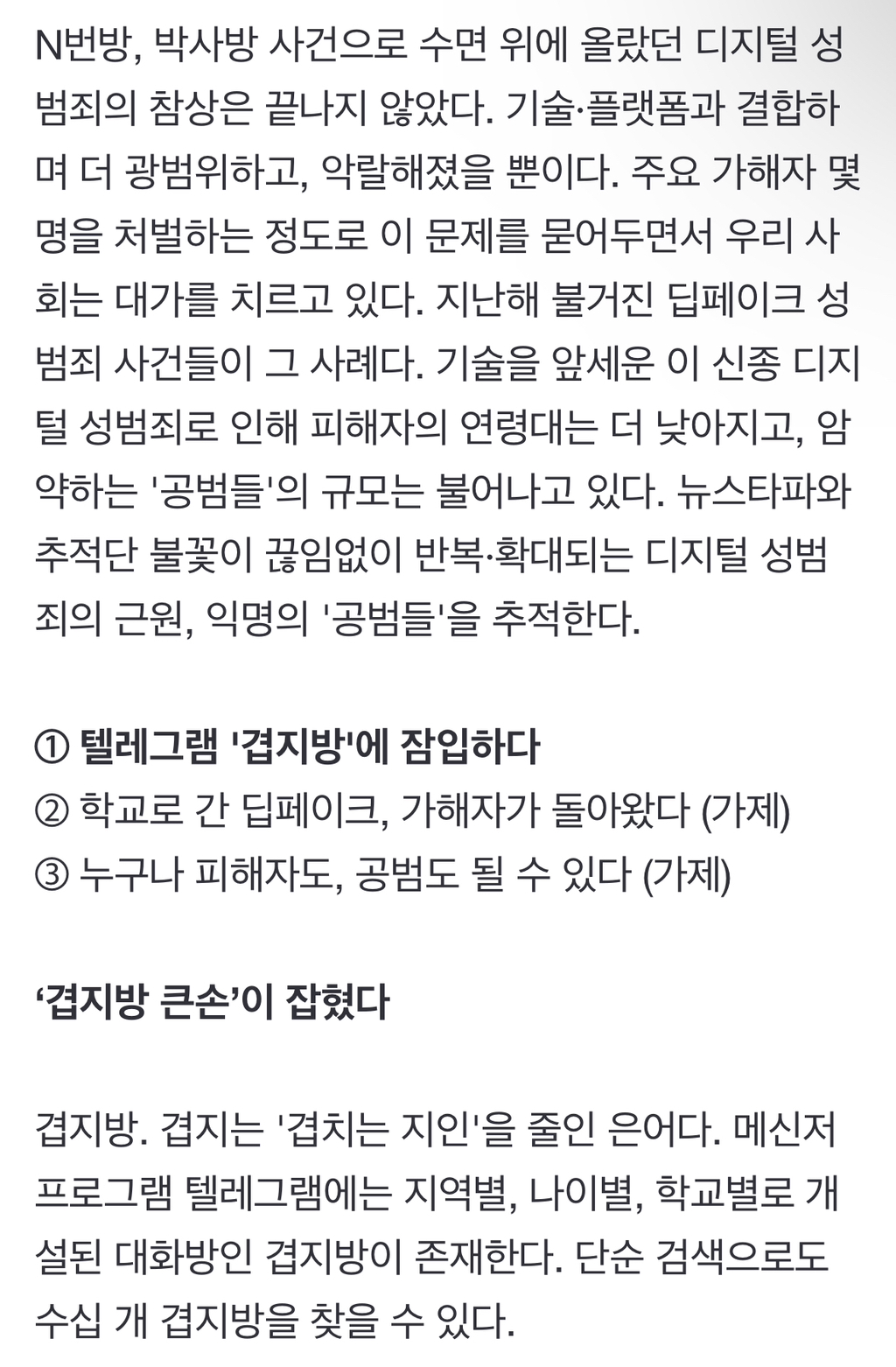 [여시뉴스데스크]딥페이크의 공범들 ① 텔레그램 '겹지방' 에 잠입하다 작성자소리앙|작성시간25.03.14|조회수737 목록 댓글 1 글자크기 작게가 글자크기 크게가 출처: https://naver.me/xq3tR5yX딥페이크의 공범들 ① 텔레그램 '겹지방' 에 잠입하다N번방, 박사방 사건으로 수면 위에 올랐던 디지털 성범죄의 참상은 끝나지 않았다. 기술·플랫폼과 결합하며 더 광범위하고, 악랄해졌을 뿐이다. 주요 가해자 몇 명을 처벌하는 정도로 이 문제를n.news.naver.com전문출처 다음검색 현재 게시글 추가 기능 열기 북마크 공유하기 신고 센터로 신고 댓글 댓글 1 댓글쓰기 답글쓰기 댓글 리스트 작성자레이디올냥 | 작성시간 25.03.14 범죄 좀 뿌리 뽑았으면 하…. 댓글 전체보기