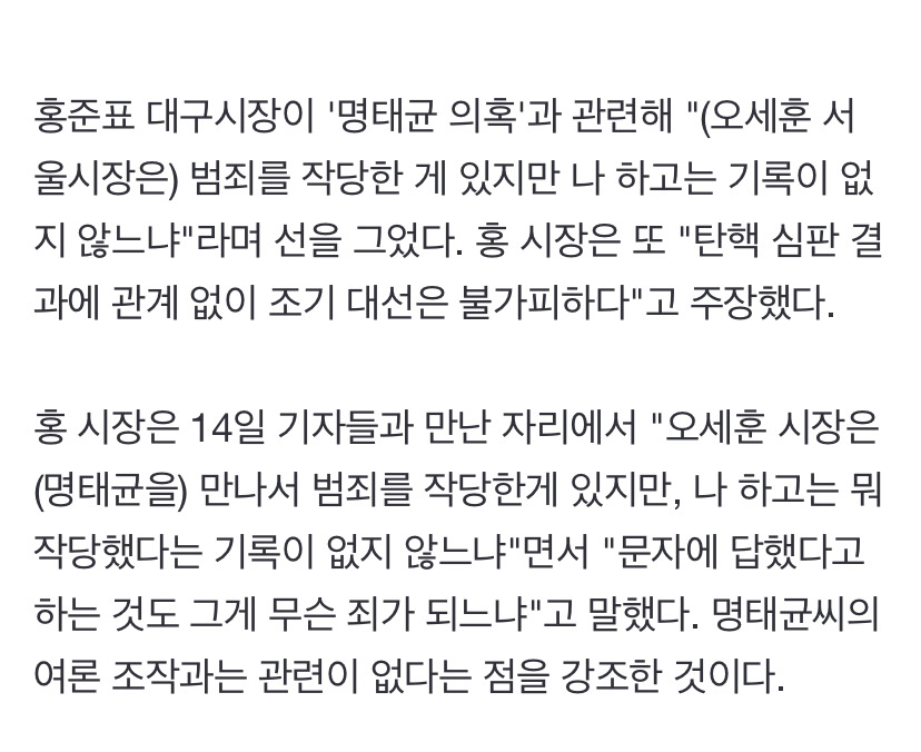 [여시뉴스데스크]홍준표 "오세훈은 작당한 게 있지만...난 명태균 문자만 답해" 작성자개빡쳐|작성시간25.03.15|조회수1,091 목록 댓글 4 글자크기 작게가 글자크기 크게가 출처: https://n.news.naver.com/article/053/0000048685?cds=news_my홍준표 "오세훈은 작당한 게 있지만...난 명태균 문자만 답해"홍준표 대구시장이 '명태균 의혹'과 관련해 "(오세훈 서울시장은) 범죄를 작당한 게 있지만 나 하고는 기록이 없지 않느냐"라며 선을 그었다. 홍 시장은 또 "탄핵 심판 결과에 관계 없이 조기 대n.news.naver.com 아재욬ㅋㅋㅋㅋㅋ 털끝만큼도 관련없다면서요 다음검색 현재 게시글 추가 기능 열기 북마크 공유하기 신고 센터로 신고 댓글 댓글 4 댓글쓰기 답글쓰기 댓글 리스트 작성자돈룩없 | 작성시간 25.03.15 그래 서로 싸워라 작성자이런 명신 | 작성시간 25.03.15 영감탱 입여무셈 작성자윤석열을 파면하라 파면하라 | 작성시간 25.03.15 문자 답한게 죄다 뱅신아 작성자일본망해 | 작성시간 25.03.15 ㅋㅋㅋ둘이 싸워~~ 댓글 전체보기