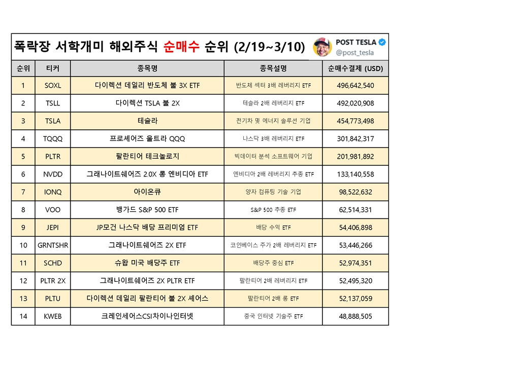 [스크랩] [흥미돋]한국인 미국주식 순매수 순위 TOP14 (2025.2.19~3.10) 작성자Dlywweeee|작성시간25.03.15|조회수3,517 목록 댓글 12 글자크기 작게가 글자크기 크게가 출처: 여성시대 Dlywweeee 다음검색 스크랩 원문 : *여성시대* 차분한 20대들의 알흠다운 공간 현재 게시글 추가 기능 열기 북마크 공유하기 신고 센터로 신고 댓글 댓글 12 댓글쓰기 답글쓰기 댓글 리스트 작성자코딱지친구 | 작성시간 25.03.15 저점 나온거 같아서 투슬라 삼슬라만 싹 긁어모음 작성자하얀마음백범김구 | 작성시간 25.03.15 와 레버ㄷㄷㄷㄷ엔비 슬라 구글 itot 주음 작성자야망뱁새 | 작성시간 25.03.15 와 난 레버리지 쳐다도 안보는데 대단해 작성자버티면광명 | 작성시간 25.03.16 속슬 사지마세요 제발.. 작성자빨랑틔어 | 작성시간 25.03.16 ㅋㅋㅋㅋㅋ레버리지의 민족 댓글 전체보기