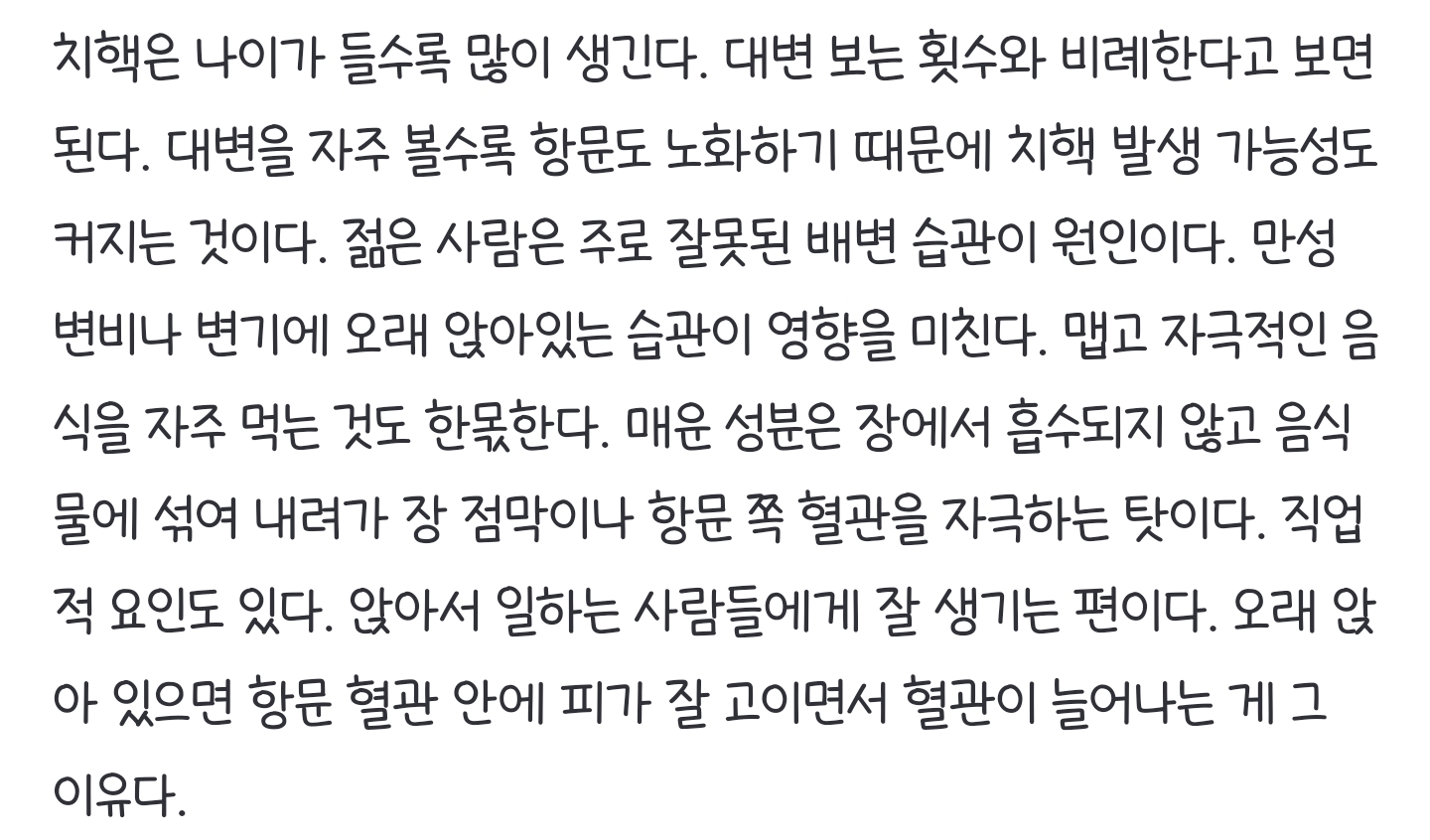 [여시뉴스데스크]대변 볼 때마다 항문 늙는다… 노화 막는 배변 방법은? 작성자너너뉘기야|작성시간25.03.15|조회수37,386 목록 댓글 43 글자크기 작게가 글자크기 크게가 출처 : https://naver.me/xtg66q7X대변 볼 때마다 항문 늙는다… 노화 막는 배변 방법은?없던 치핵이 갑자기 생길 때가 있다. 노화 때문일 수도, 잘못된 생활 습관 때문일 수도 있다. 수술밖에 답이 없을까? 치핵은 나이가 들수록 많이 생긴다. 대변 보는 횟수와 비례한다고 보면 된다.n.news.naver.com• • • 다음검색 현재 게시글 추가 기능 열기 북마크 공유하기 신고 센터로 신고 댓글 댓글 43 댓글쓰기 답글쓰기 댓글 리스트 답댓글 작성자엘지세이커스 | 작성시간 25.03.15 너너뉘기야 고마워 여시야! 작성자어걷자 | 작성시간 25.03.15 인간 살기 힘드네... 근데 폰트 뭐지 졸귀 답댓글 작성자너너뉘기야 작성자 본인 여부 작성자 | 작성시간 25.03.15 작은시인ST! 작성자너그러다장가못간다ㅋ | 작성시간 25.03.15 오 마이 돈ㅜ고 작성자여름이이싫습니다악각 | 작성시간 25.03.15 ㅠ 유튜브 타임인데요 . . 댓글 전체보기