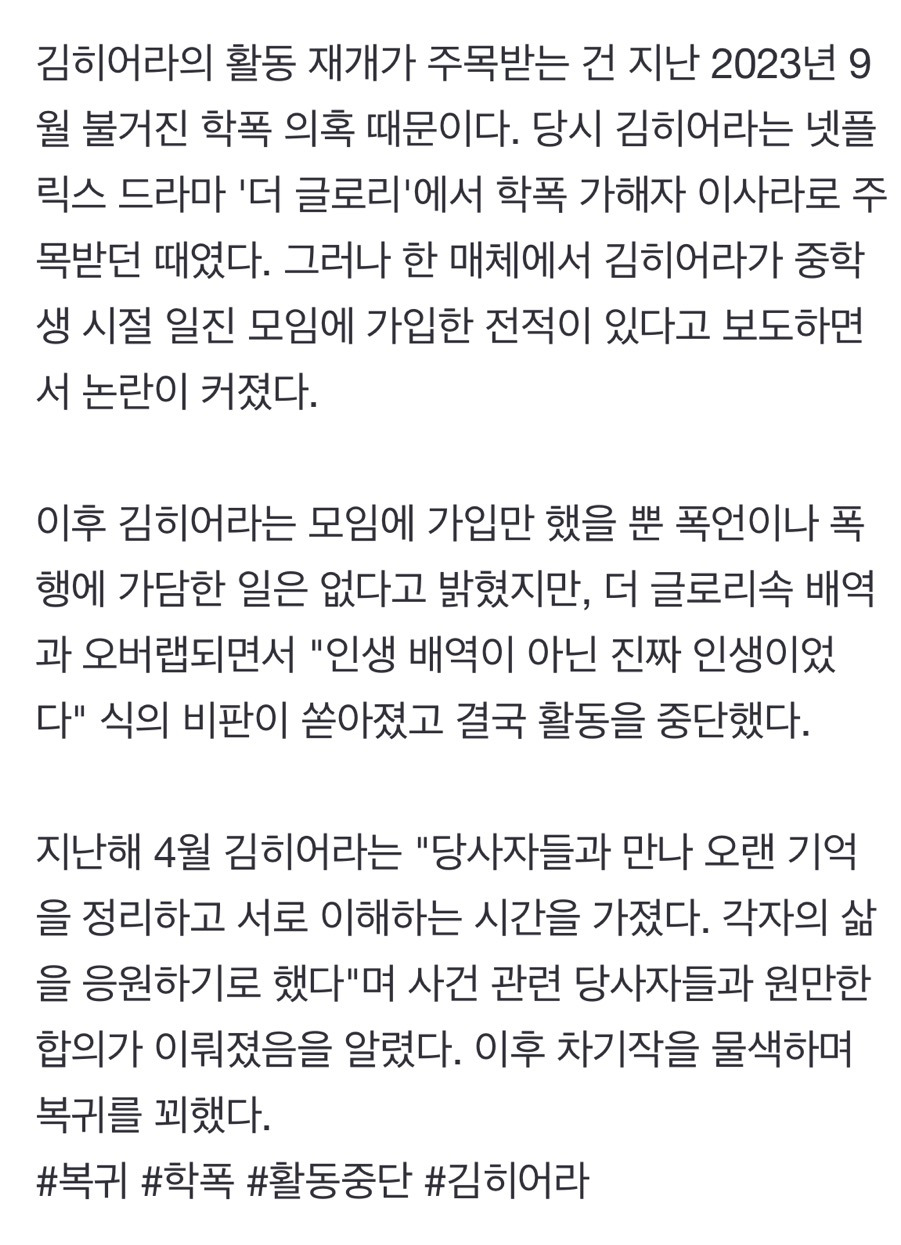 [여시뉴스데스크]'학폭 논란' 김히어라, 2년만에 활동 재개… 복귀작은 영화 '구원자' 작성자안은진|작성시간25.03.15|조회수8,711 목록 댓글 47 글자크기 작게가 글자크기 크게가 출처: 여성시대 안은진https://n.news.naver.com/article/014/0005320925?sid=102'학폭 논란' 김히어라, 2년만에 활동 재개… 복귀작은 영화 '구원자'학교폭력 논란으로 활동을 중단한 배우 김히어라가 2년 만에 복귀 소식을 알렸다. 소속사 그램엔터테인먼트는 김히어라가 영화 '구원자'에 출연한다고 13일 전했다. 영화는 기적의 대가로 주어n.news.naver.com 다음검색 현재 게시글 추가 기능 열기 북마크 공유하기 신고 센터로 신고 댓글 댓글 47 댓글쓰기 답글쓰기 댓글 리스트 작성자이초 | 작성시간 25.03.15 ㅎㅇㅌ~! 작성자코얌코얌 | 작성시간 25.03.15 연기 기대~! 작성자후이는그판다 | 작성시간 25.03.15 피해자분들도 회복의 기회셨기를..! 작성자이세계아이돌 | 작성시간 25.03.15 연기로 보답해주시길 작성자헤이즐넛처돌이 | 작성시간 25.03.15 원만한합의+대화피해자분들께 사과 잘했으면됬지뭐... 댓글 전체보기