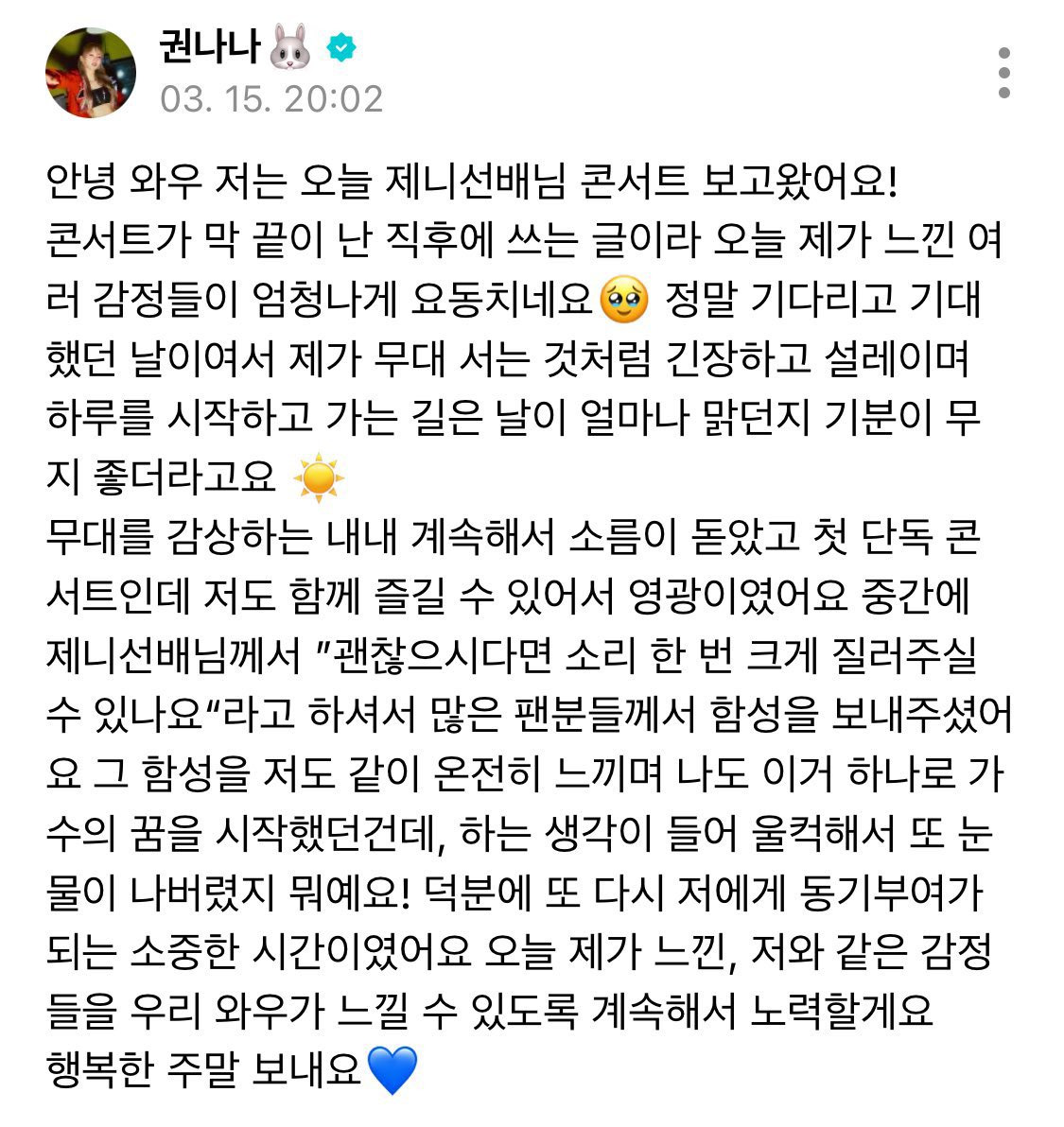 [흥미돋]연예인 엄청 많이 온 오늘자 제니 콘서트.jpg 작성자THE MAN|작성시간25.03.15|조회수89,445 목록 댓글 220 글자크기 작게가 글자크기 크게가 출처: 여성시대 THE MAN유재석김지원공효진혜리NJZ (뉴진스)안소희이동휘빅뱅 대성그레이고아성위너 강승윤 이승훈 김진우미야오로제레드벨벳 아이린레드벨벳 예리레드벨벳 웬디정호연지코조세호빌리 문수아임시완김민하우아 나나정려원뱀뱀도경수트와이스 지효남주혁피오세븐틴 디노멜로디데이 차희+고경표비비미노이 다음검색 현재 게시글 추가 기능 열기 북마크 공유하기 신고 센터로 신고 댓글 댓글 220 댓글쓰기 답글쓰기 댓글 리스트 작성자고영이차차 | 작성시간 25.03.16 티켓팅 해ㅜ 작성자알파벳입력 | 작성시간 25.03.16 히야 작성자티라미숙하다 | 작성시간 25.03.17 차희도 아이돌이였구나 몰랐어 작성자개셩주왁 | 작성시간 25.03.22 유재석 어케 알아봐,,ㅋㅋㅋㅋㅋㅋㅋ 작성자원래독고다이 | 작성시간 25.04.05 Wow 댓글 전체보기