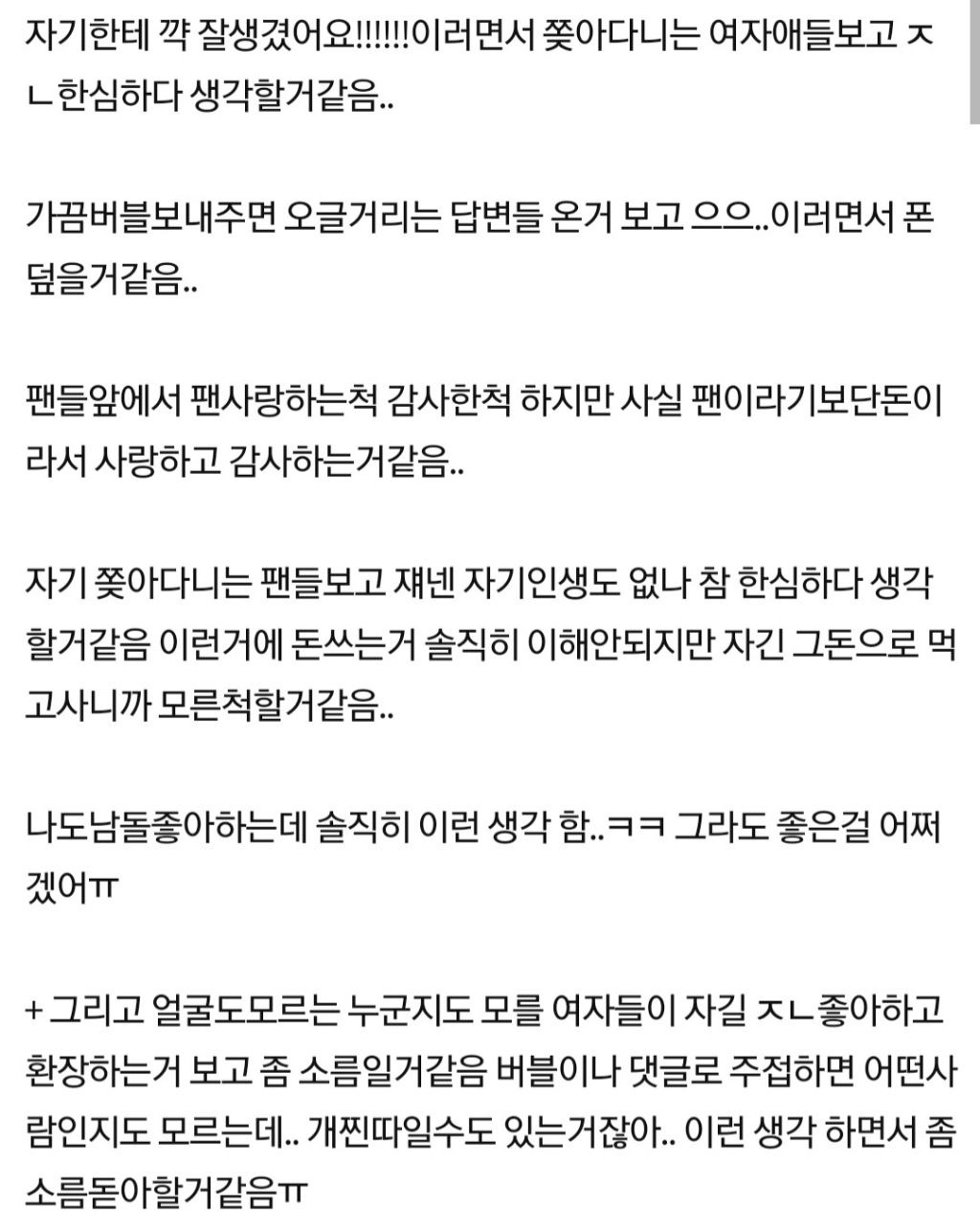 작성자칷태일 작성시간 25.03.16 심지어 남돌은 본인이 딱히 잘난것도 없다는걸 스스로 느낄텐데 실력도 없고 얼굴도 평범한 자기를 그냥 아이돌이라는 이유만으로 좋아하면 왜 못알아채지? 진짜 ㅎㅌㅊ들인가? 하는 생각할듯