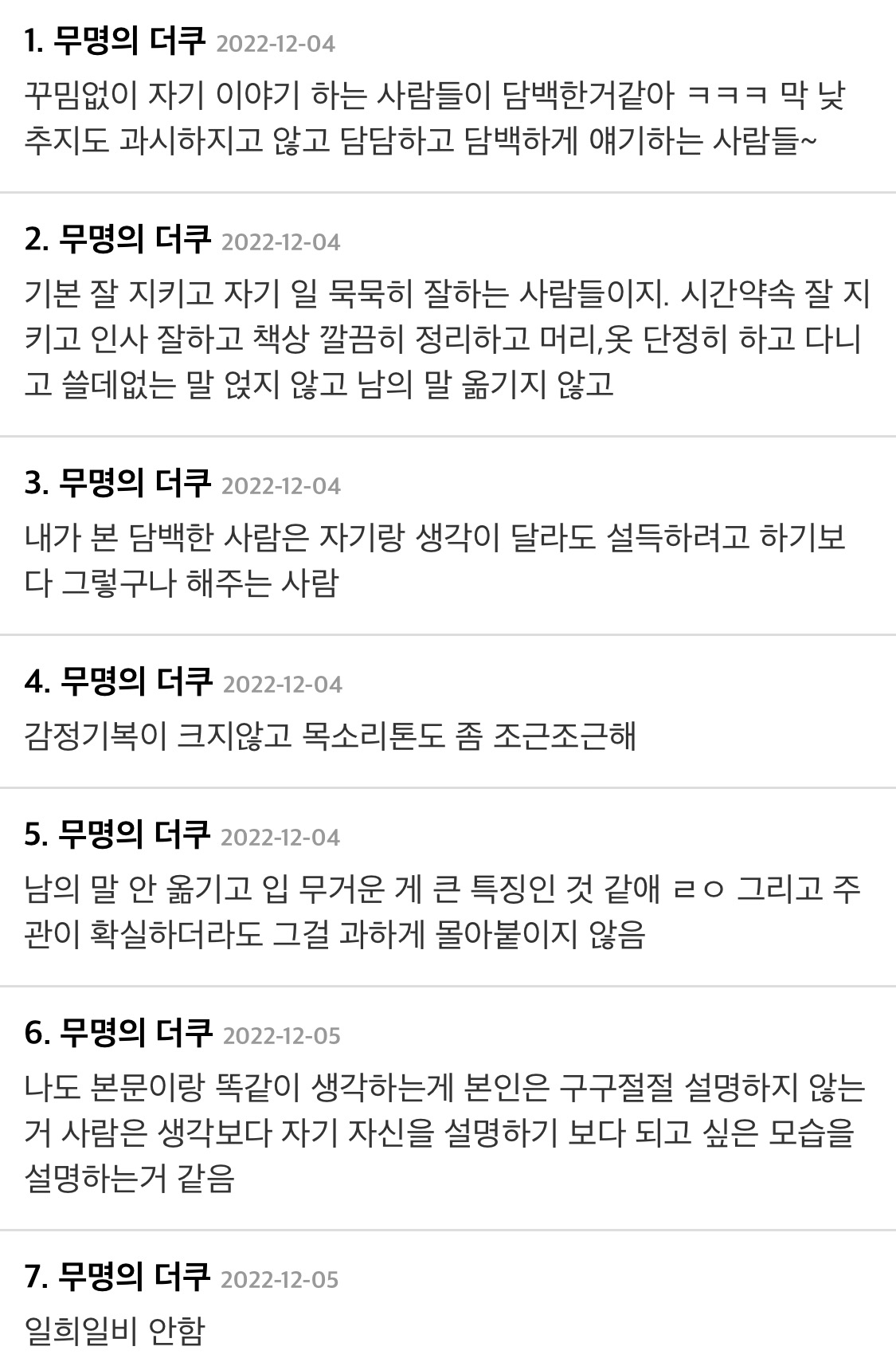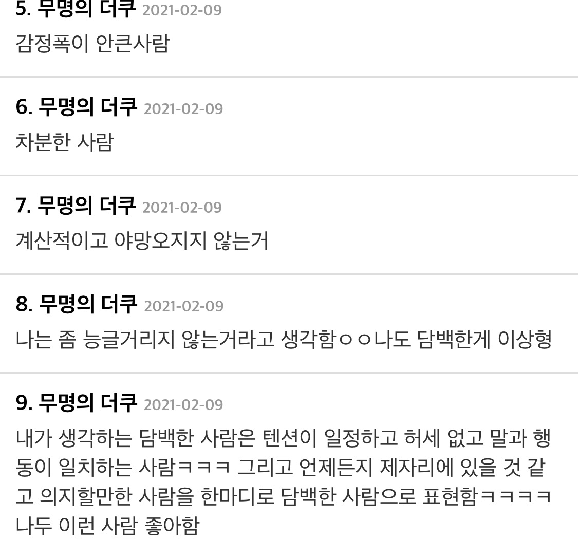 [스크랩] [흥미돋]많은 사람들이 이상형으로 꼽는 “담백한 사람”은 어떤 사람일까? 작성자냐웅잉|작성시간25.03.16|조회수14,881 목록 댓글 28 글자크기 작게가 글자크기 크게가 출처 : 여성시대 개빡센하루ㅅ1작ㅊㅊ 더쿠 인스티즈 다음검색 스크랩 원문 : *여성시대* 차분한 20대들의 알흠다운 공간 현재 게시글 추가 기능 열기 북마크 공유하기 신고 센터로 신고 댓글 댓글 28 댓글쓰기 답글쓰기 댓글 리스트 작성자다이어트성공할여시 | 작성시간 25.03.16 짜치는 행동이나 말을 아예 단 하나도 안하는 사람 작성자장 건강 지키기 | 작성시간 25.03.16 언행의 과장 없이 매사 차분하고 담담하면서 감정의 진폭이 크지 않은 사람 작성자꼭내린다 | 작성시간 25.03.16 작위적이지 않고 일희일비 안하는. . 작성자국주언니당신너무야무져 | 작성시간 25.03.16 느끼한거 못먹는 사람 작성자바라바바밥 | 작성시간 25.03.23 흠 댓글 전체보기
