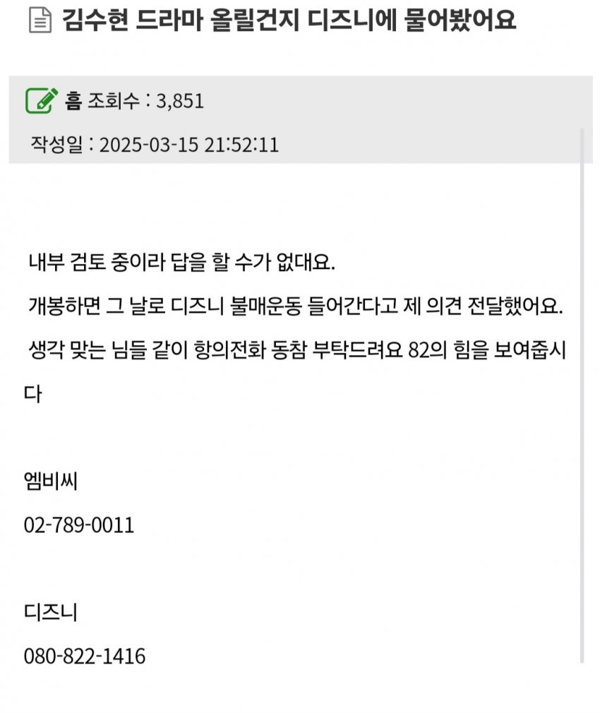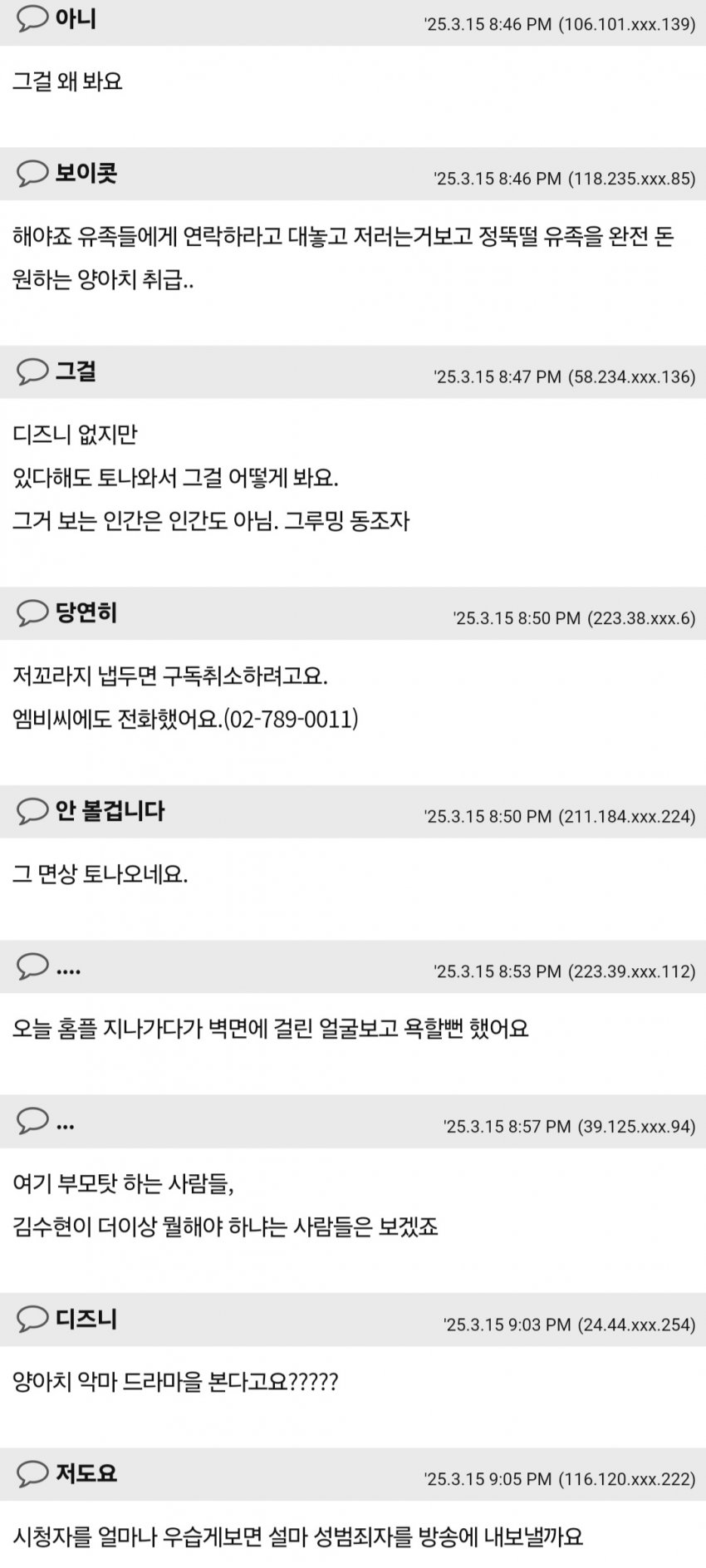 [흥미돋]82cook에서 전개중인 김수현 퇴출 운동.jpg 작성자SSAPPOSSINLE|작성시간25.03.16|조회수25,408 목록 댓글 68 글자크기 작게가 글자크기 크게가 출처: https://theqoo.net/square/3650243535 다음검색 현재 게시글 추가 기능 열기 북마크 공유하기 신고 센터로 신고 댓글 댓글 68 댓글쓰기 답글쓰기 댓글 리스트 작성자인앤아웃 | 작성시간 25.03.16 나도 동참해야겠다 저게 진짜 참어른이지 다음 맘스카페인가 거기 진짜 댓글 조선시대수준인 인간들 많더라 같은 여자가 왜저러는지 이해가 안감 남자에 미쳤나봐 작성자키위맛나 | 작성시간 25.03.16 이게맏다 작성자윤석열빨리파면해 | 작성시간 25.03.16 오 멋지다 나도 동참갈겨야지 작성자캐피바라 | 작성시간 25.03.16 딸들을 위해서라는 저 말 감동이다 ㅠㅠ 작성자볶은 통현미 | 작성시간 25.03.16 나도 동참해야지 댓글 전체보기