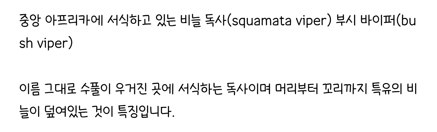 [흥미돋]용의 비늘을 가진 뱀 🐍 작성자너너뉘기야|작성시간25.03.16|조회수8,338 목록 댓글 41 글자크기 작게가 글자크기 크게가 출처: https://m.inven.co.kr/board/webzine/2097/776464?iskin=webzine용의비늘을 가진 뱀 -데이터주의- | 웹진 인벤중앙 아프리카에 서식하고 있는 비늘 독사(squamata viper) 부시 바이퍼(bush viper)이름 그대로 수풀이 우거진 곳에 서식하는 독사이며 머리부터 꼬리까지 특유의 비늘이 덮여있는 것이 특징입니다.m.inven.co.kr 다음검색 현재 게시글 추가 기능 열기 북마크 공유하기 신고 센터로 신고 댓글 댓글 41 댓글쓰기 답글쓰기 댓글 리스트 작성자관절환자 | 작성시간 25.03.16 우와 용이다 작성자대도서관 | 작성시간 25.03.16 와 개멋있어 작성자김약국의딸들 | 작성시간 25.03.16 용이잖아 작성자VIOLET WAND | 작성시간 25.03.16 아름다와요 작성자까까런 | 작성시간 25.03.16 와멋있다 댓글 전체보기