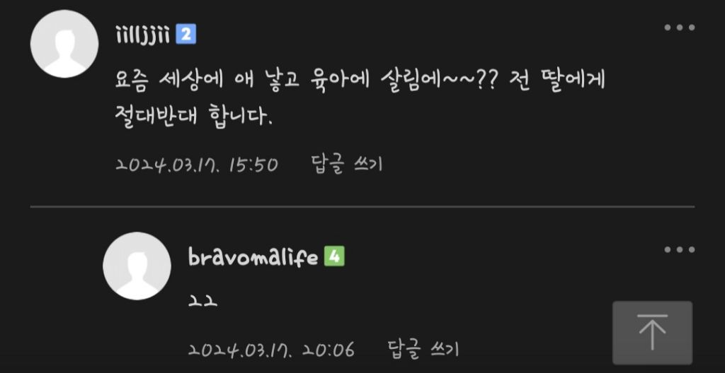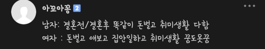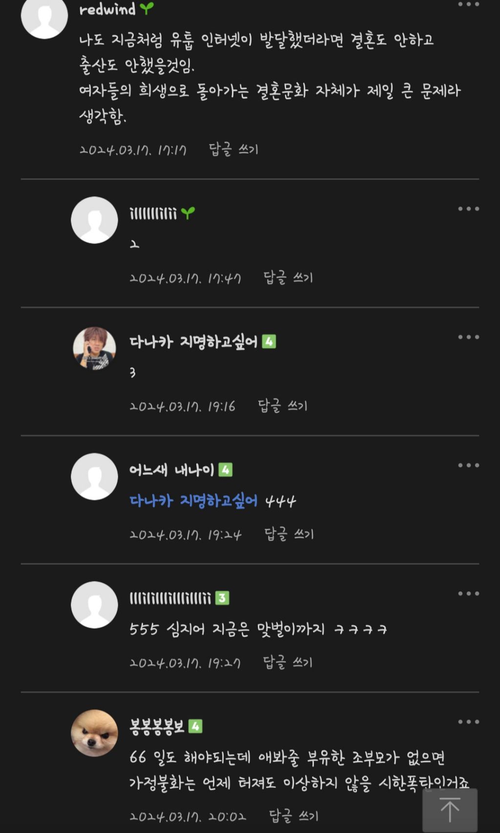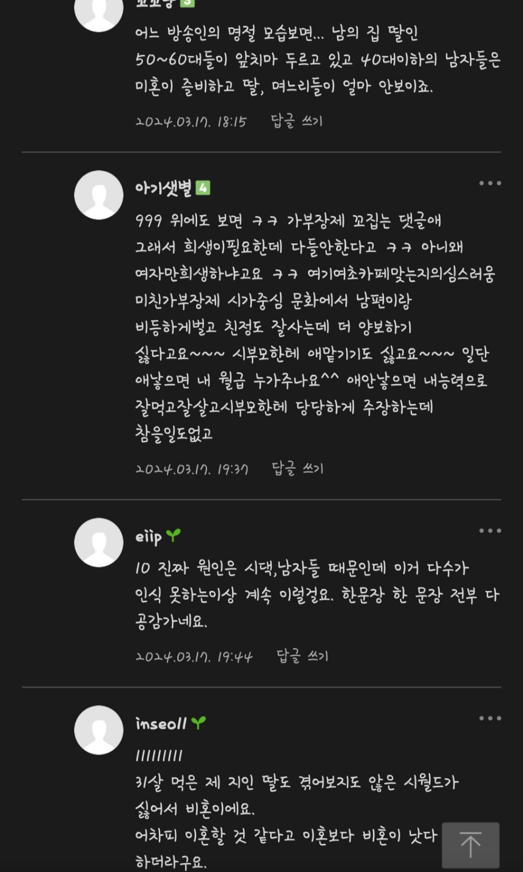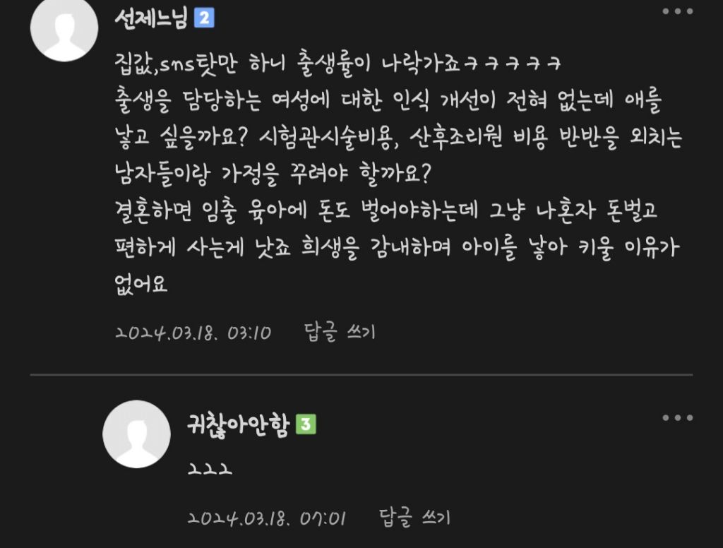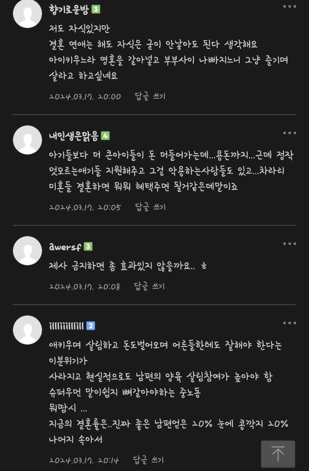 [흥미돋]핫플난, 부모세대여자들이 말하는 요즘 출산율 떨어지는 이유 ㄷㄷㄷㄷㄷ 작성자소중했던우리|작성시간25.03.16|조회수10,473 목록 댓글 28 글자크기 작게가 글자크기 크게가 출처:https://cafe.naver.com/remonterrace/31935780?tc=shared_link맘카페 왈 '여자들의 희생으로 돌아가는 결혼 문화다' 다음검색 현재 게시글 추가 기능 열기 북마크 공유하기 신고 센터로 신고 댓글 댓글 28 댓글쓰기 답글쓰기 댓글 리스트 작성자굥이가는그날까지 | 작성시간 25.03.16 울엄마도 요즘세상 같앗으면 결혼 절대 안한대 ㅎ ㅎ 미쳤냐고,, 작성자끽니부 | 작성시간 25.03.16 이 나라는 망해도 됨 진짜 작성자느개비 상견례장 봉구스밥버거 | 작성시간 25.03.16 100프로 남자때문 작성자우리함께노래불러요 | 작성시간 25.03.16 어차피 죽을 거 다 같이 죽는 거지 뭐. 나만 살아남는 것도 아닌디 뭣이 무서워? 작성자고려 빵즈 | 작성시간 25.03.16 정확하게 알고계시는군 댓글 전체보기