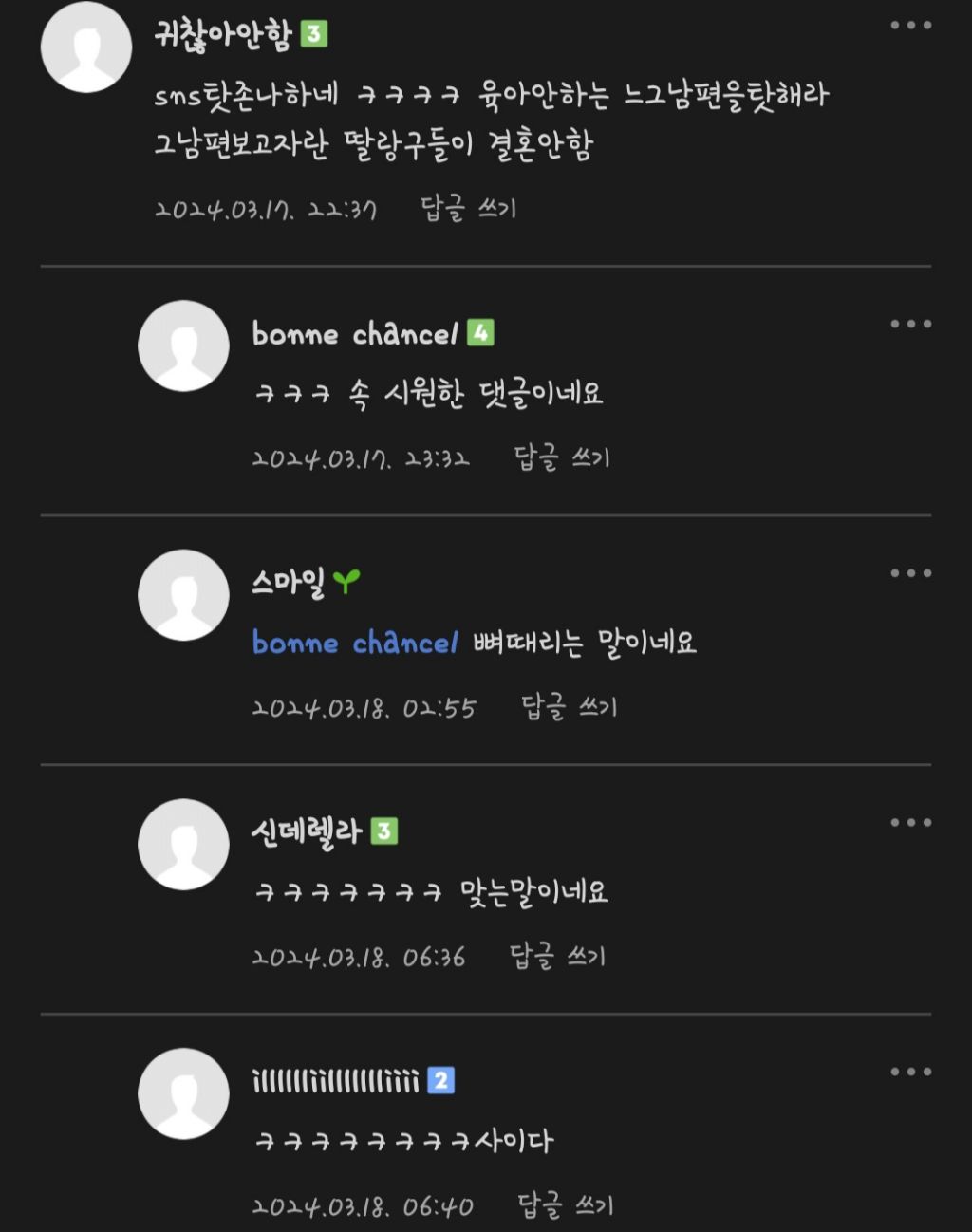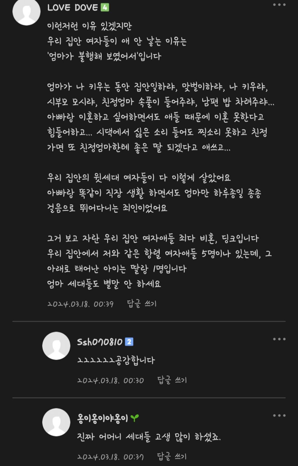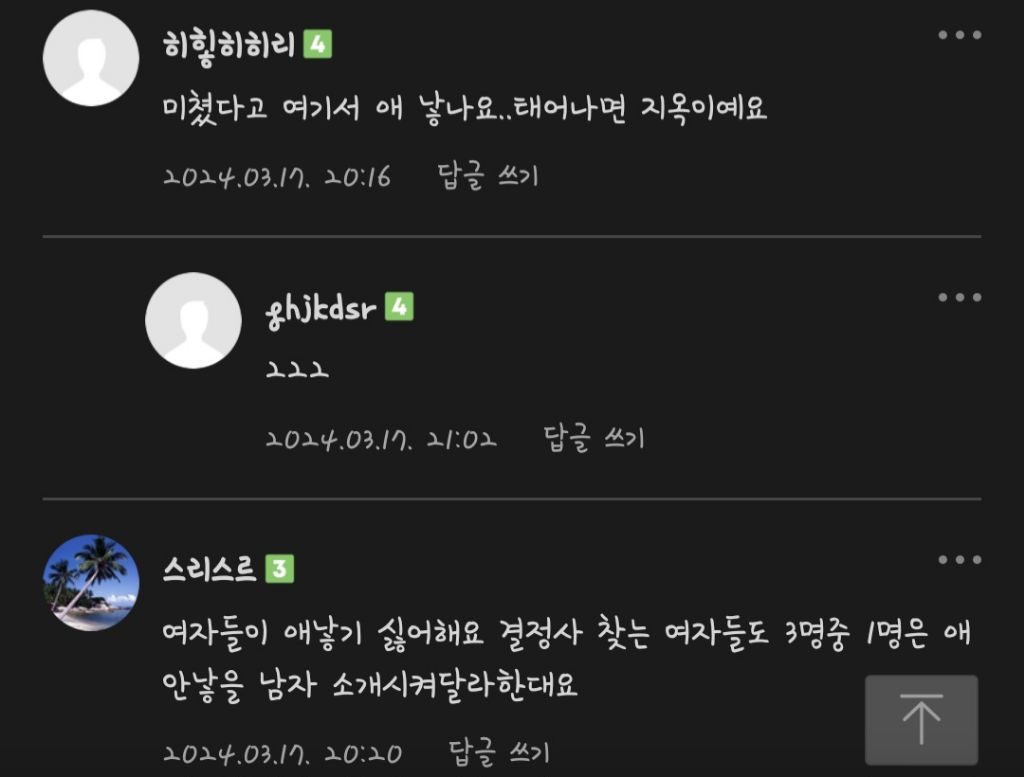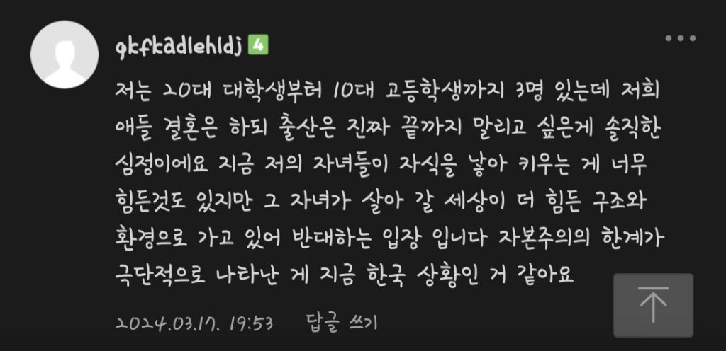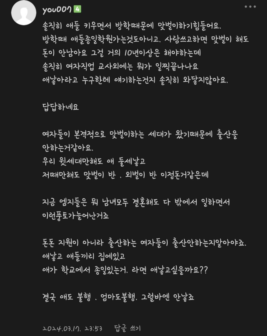 [흥미돋]핫플난, 부모세대여자들이 말하는 요즘 출산율 떨어지는 이유 ㄷㄷㄷㄷㄷ 작성자소중했던우리|작성시간25.03.16|조회수10,473 목록 댓글 28 글자크기 작게가 글자크기 크게가 출처:https://cafe.naver.com/remonterrace/31935780?tc=shared_link맘카페 왈 '여자들의 희생으로 돌아가는 결혼 문화다' 다음검색 현재 게시글 추가 기능 열기 북마크 공유하기 신고 센터로 신고 댓글 댓글 28 댓글쓰기 답글쓰기 댓글 리스트 작성자굥이가는그날까지 | 작성시간 25.03.16 울엄마도 요즘세상 같앗으면 결혼 절대 안한대 ㅎ ㅎ 미쳤냐고,, 작성자끽니부 | 작성시간 25.03.16 이 나라는 망해도 됨 진짜 작성자느개비 상견례장 봉구스밥버거 | 작성시간 25.03.16 100프로 남자때문 작성자우리함께노래불러요 | 작성시간 25.03.16 어차피 죽을 거 다 같이 죽는 거지 뭐. 나만 살아남는 것도 아닌디 뭣이 무서워? 작성자고려 빵즈 | 작성시간 25.03.16 정확하게 알고계시는군 댓글 전체보기