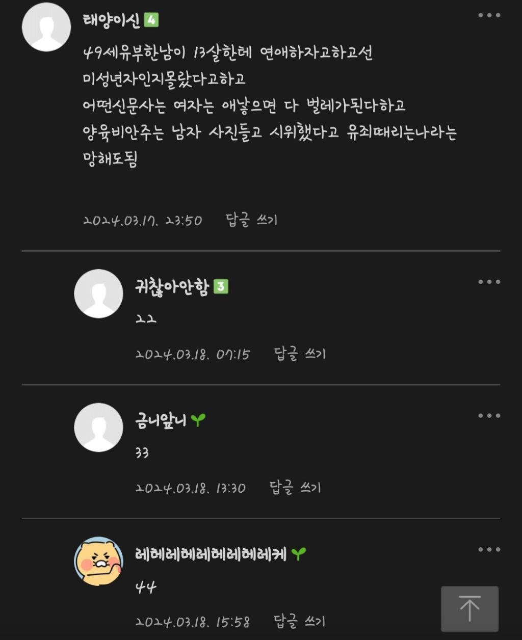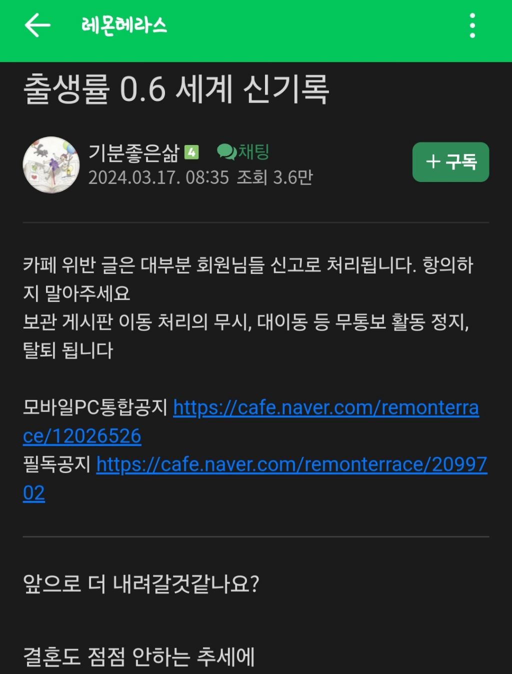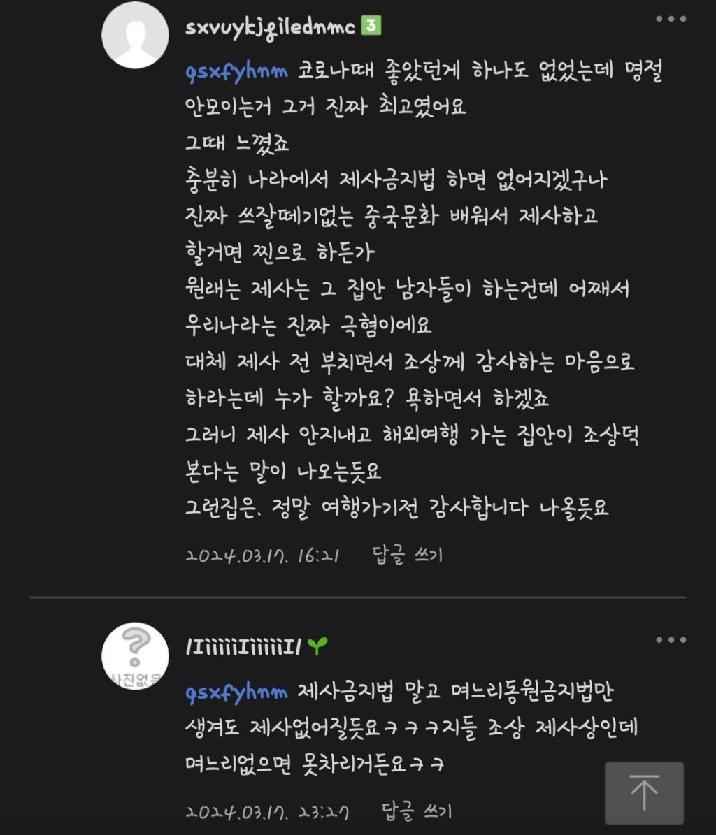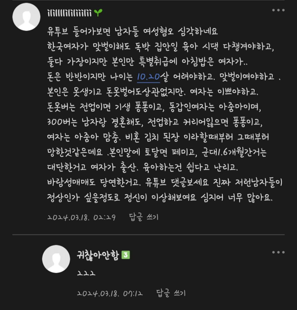 [흥미돋]핫플난, 부모세대여자들이 말하는 요즘 출산율 떨어지는 이유 ㄷㄷㄷㄷㄷ 작성자소중했던우리|작성시간25.03.16|조회수10,473 목록 댓글 28 글자크기 작게가 글자크기 크게가 출처:https://cafe.naver.com/remonterrace/31935780?tc=shared_link맘카페 왈 '여자들의 희생으로 돌아가는 결혼 문화다' 다음검색 현재 게시글 추가 기능 열기 북마크 공유하기 신고 센터로 신고 댓글 댓글 28 댓글쓰기 답글쓰기 댓글 리스트 작성자굥이가는그날까지 | 작성시간 25.03.16 울엄마도 요즘세상 같앗으면 결혼 절대 안한대 ㅎ ㅎ 미쳤냐고,, 작성자끽니부 | 작성시간 25.03.16 이 나라는 망해도 됨 진짜 작성자느개비 상견례장 봉구스밥버거 | 작성시간 25.03.16 100프로 남자때문 작성자우리함께노래불러요 | 작성시간 25.03.16 어차피 죽을 거 다 같이 죽는 거지 뭐. 나만 살아남는 것도 아닌디 뭣이 무서워? 작성자고려 빵즈 | 작성시간 25.03.16 정확하게 알고계시는군 댓글 전체보기