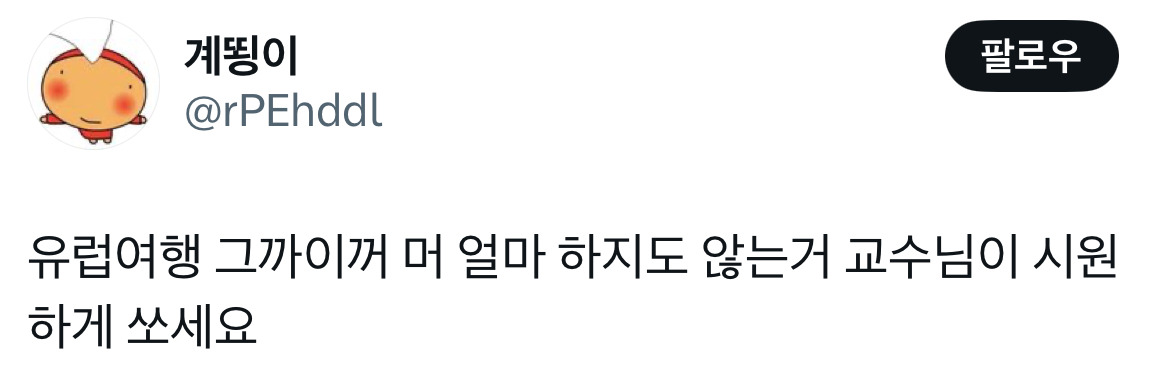 작성자제발좀가자고 작성시간 25.03.17 저런 교수들 학생들한테 밥 한 번 안 사줌 ㅎ 같이 밥먹는 자리 있더라도 무조건 학교돈 ㅎ 뭔 구준표도 아니고 유럽여행에 화들짝 ㅋㅋㅋㅋㅋㅋㅋ