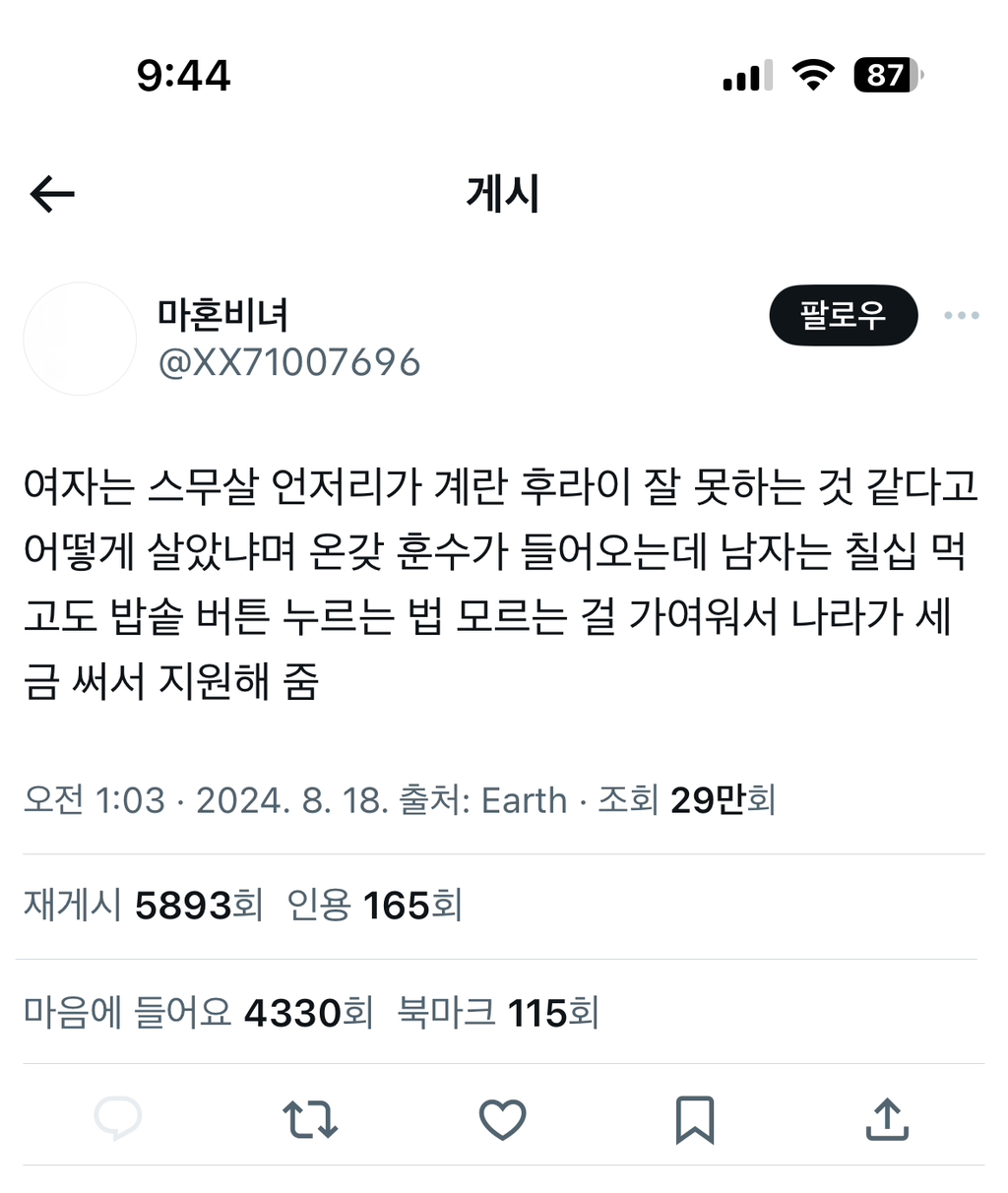 [스크랩] [기타]우리나라 요약ㅋㅋㅋㅋㅋ.twt 작성자정상인한녀들은힘듭니다|작성시간25.03.16|조회수16,326 목록 댓글 17 글자크기 작게가 글자크기 크게가 다음검색 스크랩 원문 : 쭉빵카페 현재 게시글 추가 기능 열기 북마크 공유하기 신고 센터로 신고 댓글 댓글 17 댓글쓰기 답글쓰기 댓글 리스트 작성자오렌지토마토 | 작성시간 25.03.16 그냥 부랄(앞똥)달고 태어나는게 벼슬임.. 여자 갈아서 유지되는 자슬아치 국가 작성자언포기븐 | 작성시간 25.03.16 ㅅㅂ ㅋㅋㅋ 작성자제임스 맥어보이 | 작성시간 25.03.16 ㄹㅇ맞말 개빡침 작성자산토끼산토끼야 | 작성시간 25.03.16 ㅅㅂ 작성자뽁떵이 | 작성시간 25.03.17 진짜 너무 짜증나지 않아? 댓글 전체보기