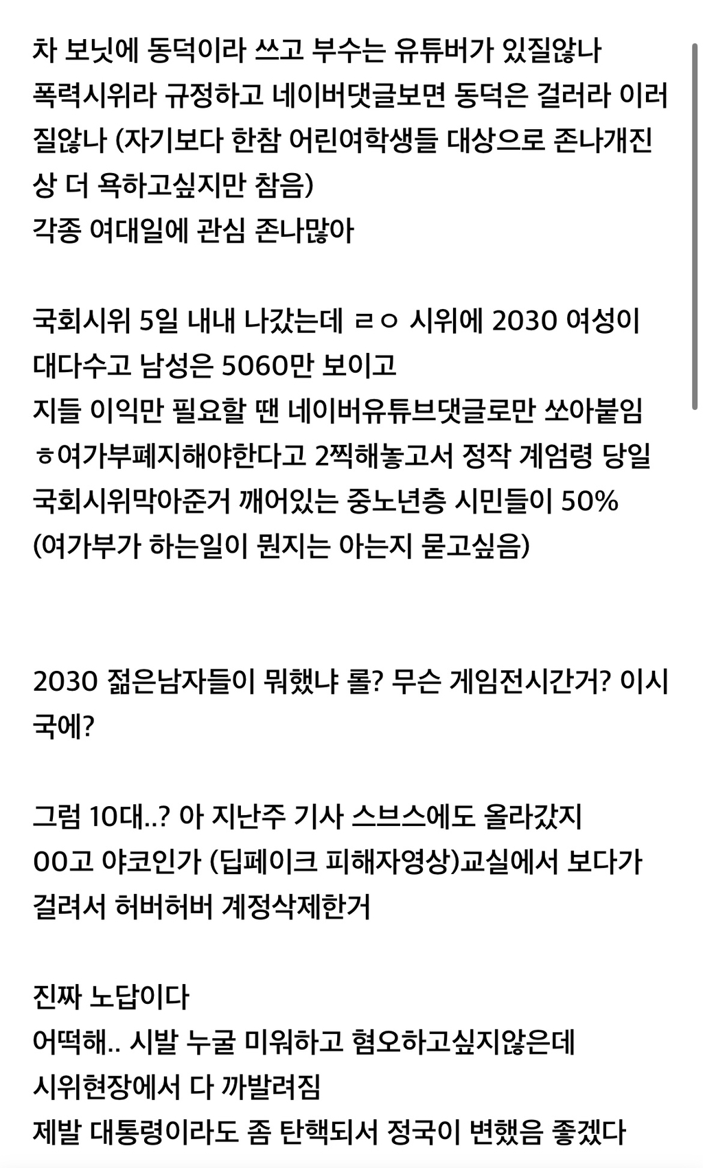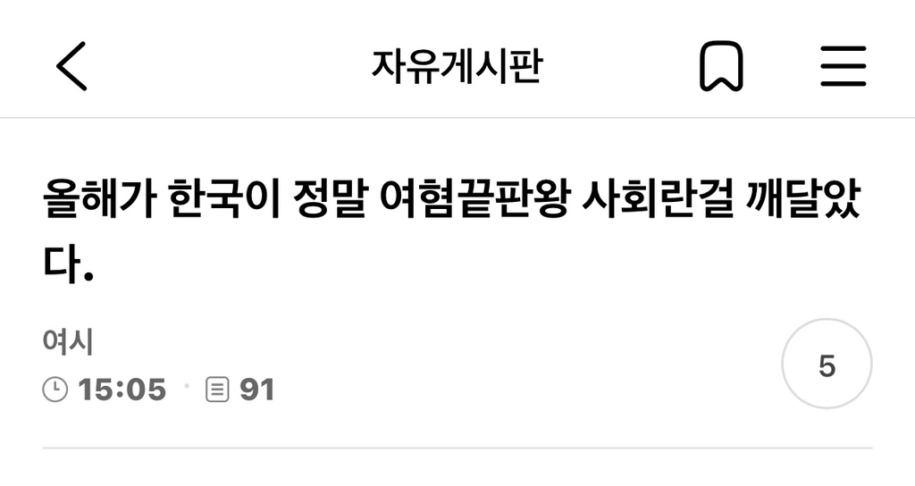 [기타]올해가 한국이 정말 여혐끝판왕 사회란걸 깨달았다. 작성자INTP_|작성시간25.03.16|조회수6,620 목록 댓글 9 글자크기 작게가 글자크기 크게가 출처: 여성시대 https://m.cafe.daum.net/subdued20club/Lp0T/164057047모든 이야기의 시작 - Daum 카페모든 이야기의 시작, Daum 카페m.cafe.daum.netㅇㄱㄹㅇ 지나가는 2030 한남보이면저사람도 시위안갔겠지 이러는중 ㅠ 다음검색 현재 게시글 추가 기능 열기 북마크 공유하기 신고 센터로 신고 댓글 댓글 9 댓글쓰기 답글쓰기 댓글 리스트 작성자무화과깜빠뉴 | 작성시간 25.03.16 매일 느껴 무슨 문제만 생가면 다 여자탓임 작성자이제 진짜 일하러간다 | 작성시간 25.03.16 ㅁㅈ ㅋㅋㅋㅋㅋㅋㅋㅋㅋㅋㅋㅋㅋ 작성자여행가는초아 | 작성시간 25.03.16 ㅇㅈㅋㅋㅋ10 20 30 한남 걍 범죄단체지 인간아님 작성자엘송합니다 | 작성시간 25.03.16 진심 전 세대 한남들 망함. 내란수괴범때문에 더 기살아서 날뛰는 중 ;; 작성자슈퍼리치 | 작성시간 25.03.16 나도그생각부터들더라 댓글 전체보기