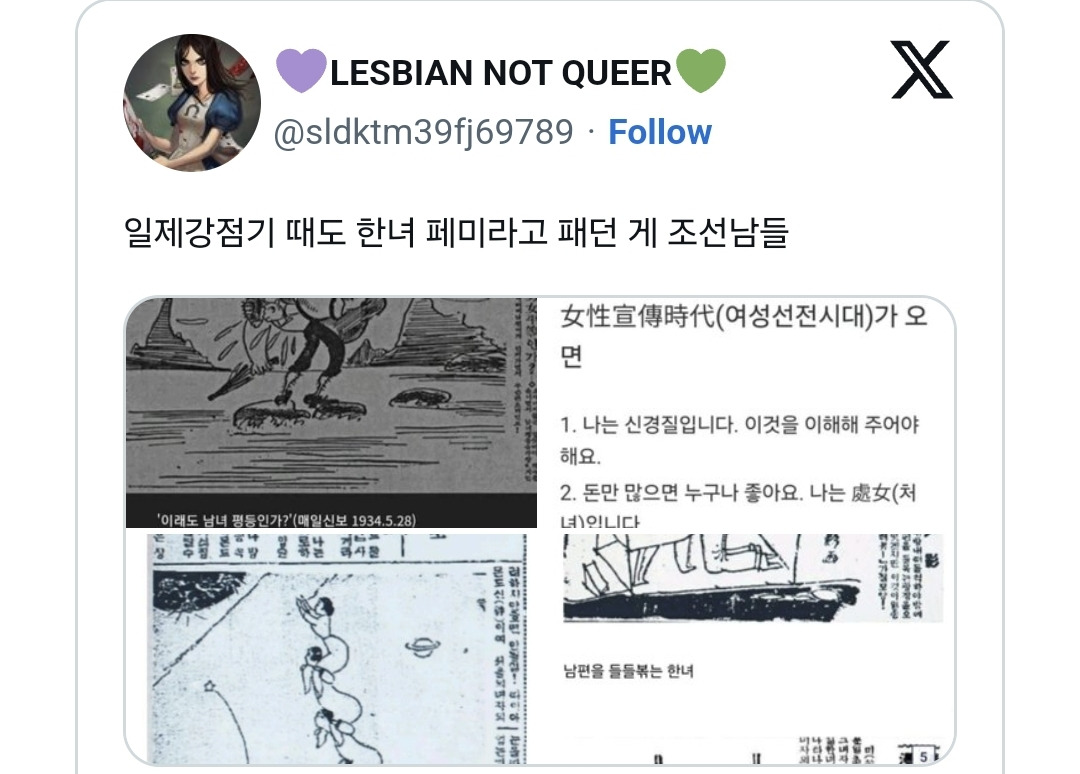 [기타]??: 요즘 한국남자들은 옛날에 비해 인셀화 된듯 작성자하키채|작성시간25.03.16|조회수11,296 목록 댓글 32 글자크기 작게가 글자크기 크게가 출처: https://x.com/sldktm39fj69789/status/1899313995728990402?t=WKZDAuop6ytM8jQspi_VDg&s=19 다음검색 현재 게시글 추가 기능 열기 북마크 공유하기 신고 센터로 신고 댓글 댓글 32 댓글쓰기 답글쓰기 댓글 리스트 작성자래번클로 | 작성시간 25.03.16 음 역시 작성자감정평가사 | 작성시간 25.03.16 토종한남 작성자배움을 갈구하는데유 | 작성시간 25.03.16 음 토종 작성자냥냥냐냐냐냥 | 작성시간 25.03.16 와 저 마지막 삽화 웹툰도 있잖아ㅋㅋㅋㅋ 진짜 토종이네ㅋㅋㅋㅋㅋㅋㅋㅋㅋㅋ 작성자Beagle | 작성시간 25.03.17 재기도 안하고 잘도 살아내려오냐 으 댓글 전체보기