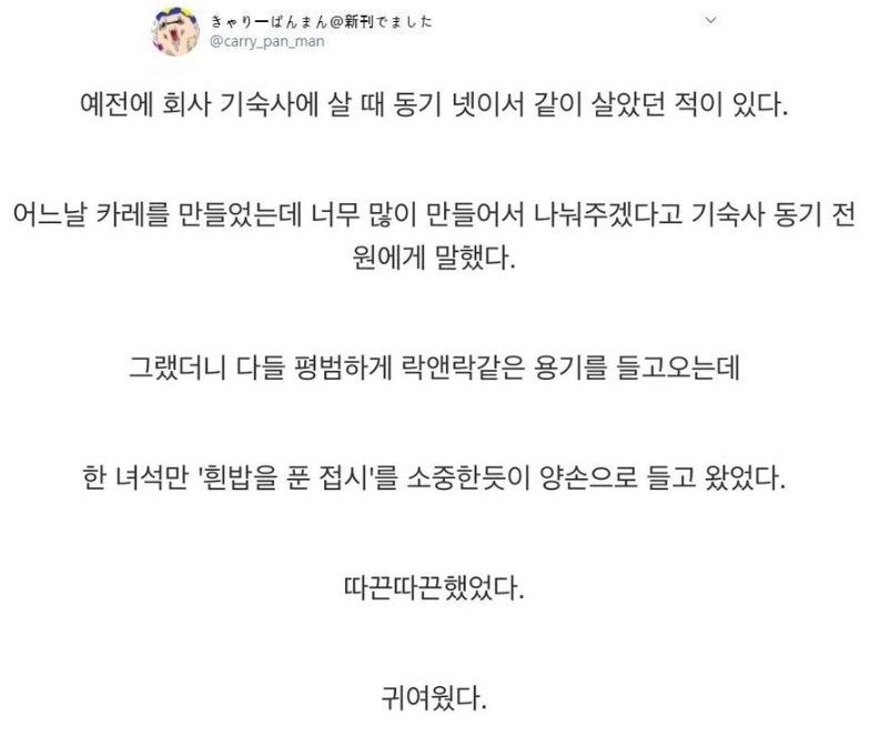 [흥미돋]예전에 회사 기숙사에 살 때 동기 넷이서 같이 살았던 적이 있다. 어느날 카레를 만들었는데 너무 많이 만들어서.twt 작성자카이지|작성시간25.03.16|조회수31,446 목록 댓글 32 글자크기 작게가 글자크기 크게가 출처: https://twitter.com/allmyheart319/status/1900461552467402910?t=0KQtbNOWgzCIgaIxoarFmQ&s=19 다음검색 현재 게시글 추가 기능 열기 북마크 공유하기 신고 센터로 신고 댓글 댓글 32 댓글쓰기 답글쓰기 댓글 리스트 작성자770929 | 작성시간 25.03.16 귀여워ㅜㅜㅜ 작성자무하민 | 작성시간 25.03.16 귀여워 ㅋㅋㅋㅋ 작성자뜰뉴뱅 | 작성시간 25.03.16 귀여웤ㅋㅋㅋㅋ 작성자dldks | 작성시간 25.03.16 먹는거에 진심인거같아서 귀여움 ㅋㅋㅋㅋ 작성자소고기먹었지롱 | 작성시간 25.03.17 ㄱㅇㅇ.... 댓글 전체보기