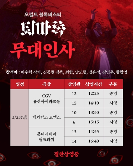 관객들의 뜨거운 사랑에 보답하는 이번 감사 무대인사는 퇴마 어벤져스 4인방을 연기한 성우 최한(박신부 역), 남도형(이현암 역), 정유정(장준후 역), 김연우(현승희 역)를 비롯해, 강렬한 빌런 연기로 관객들을 사로잡은 성우 황창영(서교주 역), 그리고 이우혁 작가와 김동철 감독이 CGV 용산아이파크몰, 메가박스 코엑스, 롯데시네마 월드타워를 방문해 극장을 찾아 준 관객들에게 특별한 시간을 선물할 예정이다. 성우 무대인사와 관련한 자세한 사항은 각 극장 홈페이지를 통해 확인할 수 있다.