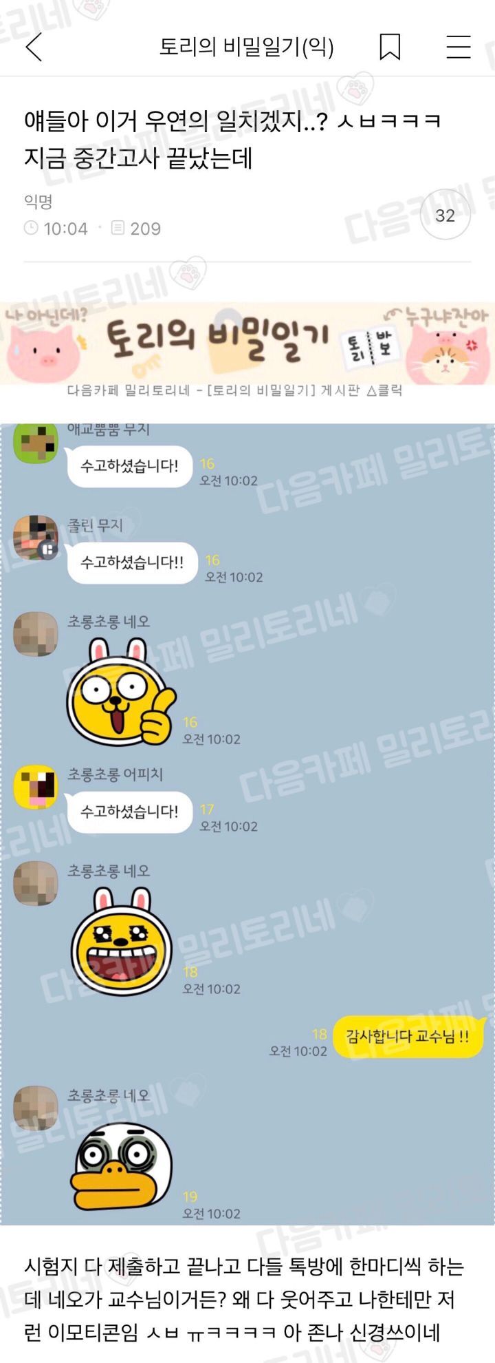 작성자선유로 작성시간 25.03.17 아ㅋㅋㅋㅋㅋㅋㅋ 학기내내 전전긍긍 신경쓰이는데 웃김ㅋ