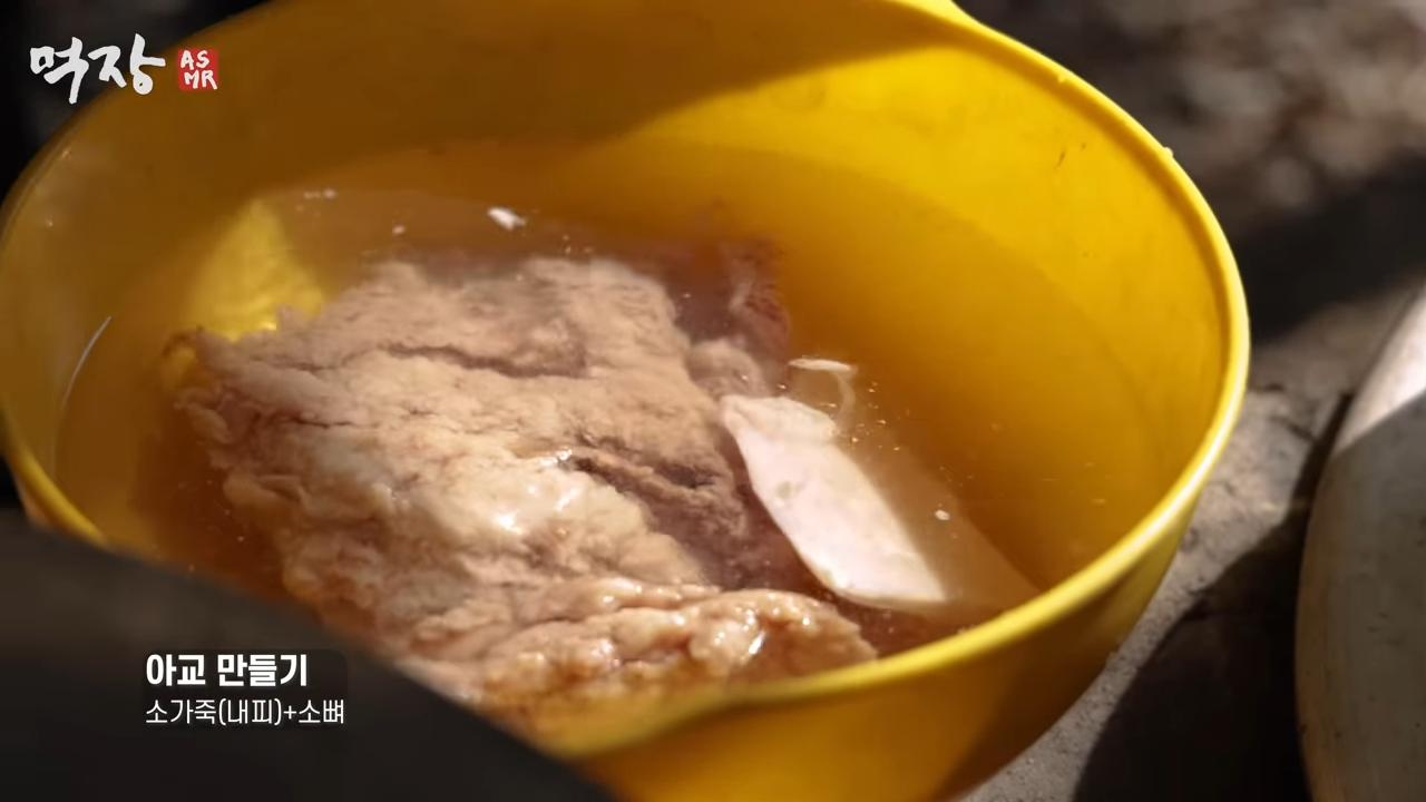 소가죽과 소뼈를 24시간 이상 끓여서 아교를 만듦