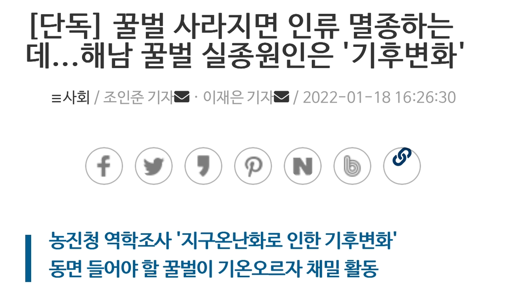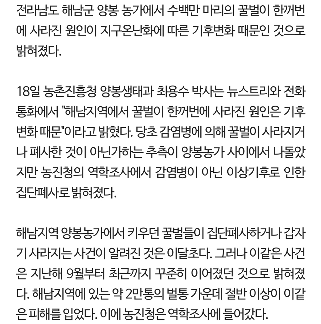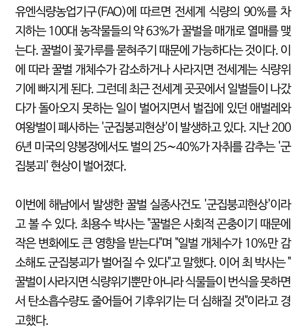 [스크랩] [흥미돋][단독] 꿀벌 사라지면 인류 멸종하는데...해남 꿀벌 실종원인은 '기후변화'(2022-01-18) 작성자밈민밈민|작성시간25.03.16|조회수1,452 목록 댓글 3 글자크기 작게가 글자크기 크게가 출처: https://www.newstree.kr/newsView/ntr202201180005#google_vignette[단독] 꿀벌 사라지면 인류 멸종하는데...해남 꿀벌 실종원인은 '기후변화'▲벌이 사라진 벌통 (사진=연합뉴스) 전라남도 해남군 양봉 농가에서 수백만 마리의 꿀벌이 한꺼번에 사라진 원인이 지구온난화에 따른 기후변화 때www.newstree.kr중략자세한 내용 기사 본문 다음검색 스크랩 원문 : *여성시대* 차분한 20대들의 알흠다운 공간 현재 게시글 추가 기능 열기 북마크 공유하기 신고 센터로 신고 댓글 댓글 3 댓글쓰기 답글쓰기 댓글 리스트 작성자에그마용 | 작성시간 25.03.16 꿀벌아 안 돼ㅠ 작성자뀨률룰루 | 작성시간 25.03.16 안돼 작성자Doctor Strange | 작성시간 25.03.17 진짜 어떡해...하 ㅠㅜ 댓글 전체보기