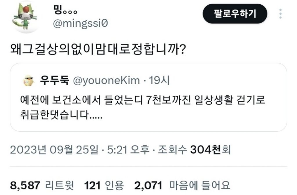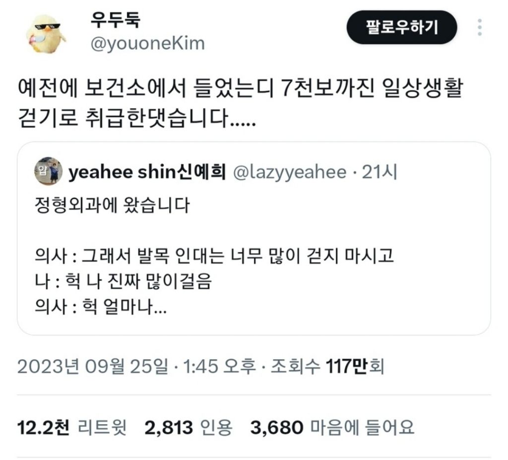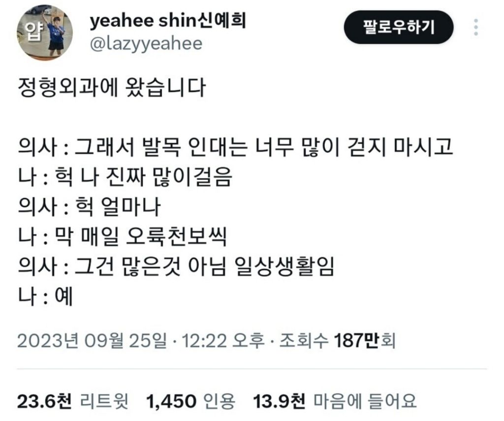 [흥미돋]정형외과 : 너무 많이 걷지 마세요.twt 작성자열심히햄마|작성시간25.03.17|조회수48,144 목록 댓글 60 글자크기 작게가 글자크기 크게가 출처: https://m.cafe.daum.net/truepicture/Qt7/1319075?svc=cafeapp그렇대.. 걷자 여시들아 다음검색 현재 게시글 추가 기능 열기 북마크 공유하기 신고 센터로 신고 댓글 댓글 60 댓글쓰기 답글쓰기 댓글 리스트 작성자아구찜광인 | 작성시간 25.03.17 7천이 일상 ? 미친 ㅎ 작성자HUNTERxHUNTER | 작성시간 25.03.17 걍 출퇴근만하고 살아도 7천보 찍히긴하던데...! 작성자나니스도넛언젠간먹을거야 | 작성시간 25.03.17 아하하하;;;; 작성자통제광 | 작성시간 25.03.17 매일 만보이상씩 걷는데 이건 괜찮것지 작성자얼룩고앵이 | 작성시간 25.03.17 하루에 만이삼천 기본으로 걷는데... 줄여야하나 댓글 전체보기