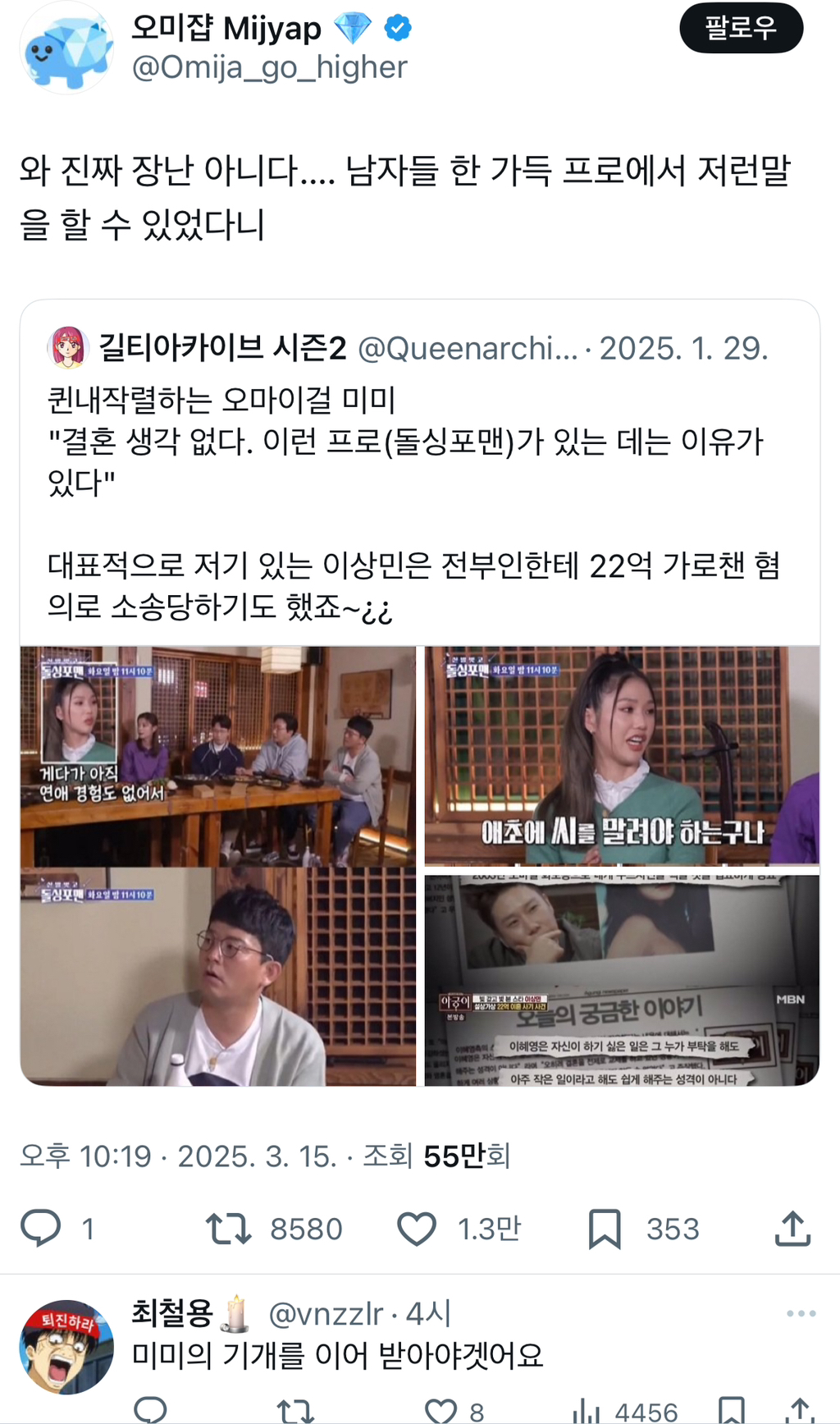 [스크랩] [기타]와 진짜 장난 아니다…. 남자들 한 가득 프로에서 저런말을 할 수 있었다니.twt 작성자타미탐이나|작성시간25.03.17|조회수66,810 목록 댓글 246 글자크기 작게가 글자크기 크게가 다음검색 스크랩 원문 : 쭉빵카페 현재 게시글 추가 기능 열기 북마크 공유하기 신고 센터로 신고 댓글 댓글 246 댓글쓰기 답글쓰기 댓글 리스트 작성자바삭한칙촉 | 작성시간 25.03.18 오늘부터 내 롤모델한다 작성자Fight for women | 작성시간 25.03.18 진심 똑똑하고 기 세다 배우고싶어 작성자천운이따르는자 | 작성시간 25.03.19 ㅋㅋㅋㅋㅋㅋ맞자나 작성자mozo | 작성시간 25.03.19 작성자까나페를떠줄수있어 | 작성시간 25.03.26 멋지다 댓글 전체보기