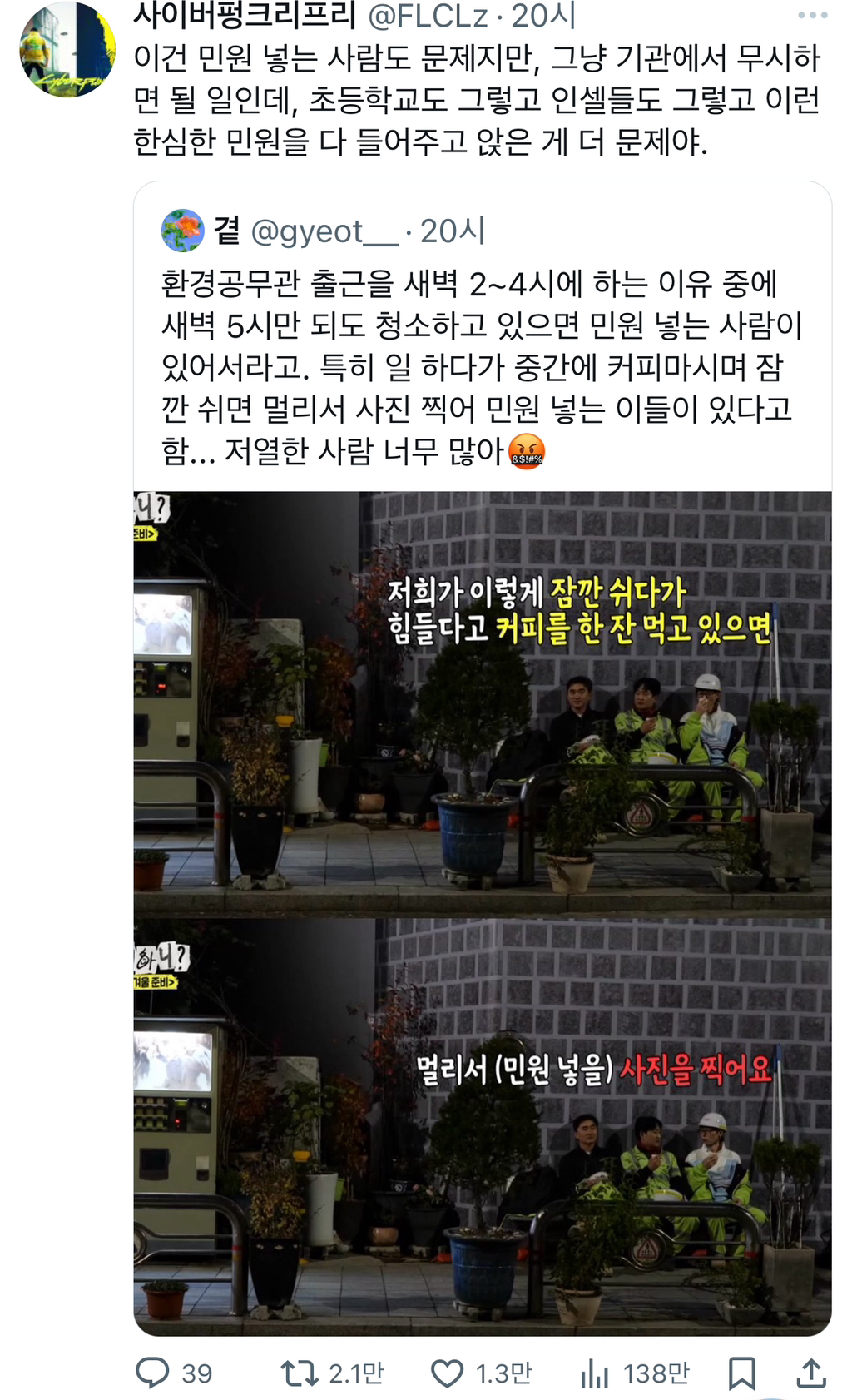 작성자ourtea 작성시간 25.03.17 경찰같은 직업도 잠깐 쉬거나 뭐 먹어도 뭐라하잖아ㅋㅋ 본인들은 일할때 한숨돌리기도 하고 쉬어도 되지만 남은 안된다 생각할걸