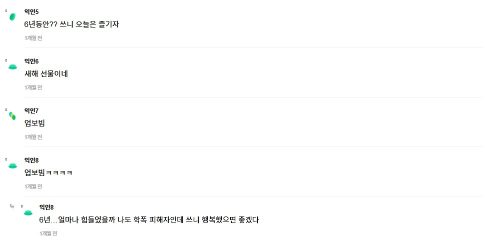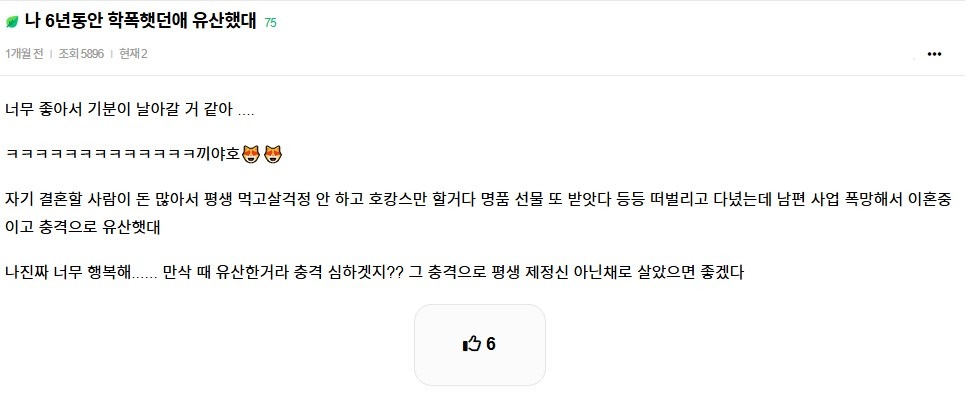 [기타]나 6년동안 학폭했던 애 유산했대 작성자민트쵸파|작성시간25.03.17|조회수24,068 목록 댓글 81 글자크기 작게가 글자크기 크게가 출처: [잡담] 나 6년동안 학폭햇던애 유산했대 - 인스티즈(instiz) 일상 카테고리 다음검색 현재 게시글 추가 기능 열기 북마크 공유하기 신고 센터로 신고 댓글 댓글 81 댓글쓰기 답글쓰기 댓글 리스트 작성자진돌히디 | 작성시간 25.03.17 앞으로도 고!!! 작성자민트초코초코코 | 작성시간 25.03.17 불임되길🙏 작성자지나가버링 | 작성시간 25.03.17 굿굿^^ 작성자로또1등 예정 | 작성시간 25.03.17 ㅋㅋ굳 앞으로 더 안좋은 일만 펼쳐지길 작성자베토벤 | 작성시간 25.03.17 부럽다 너무 나6년괴롭힌애도 받았으면 댓글 전체보기