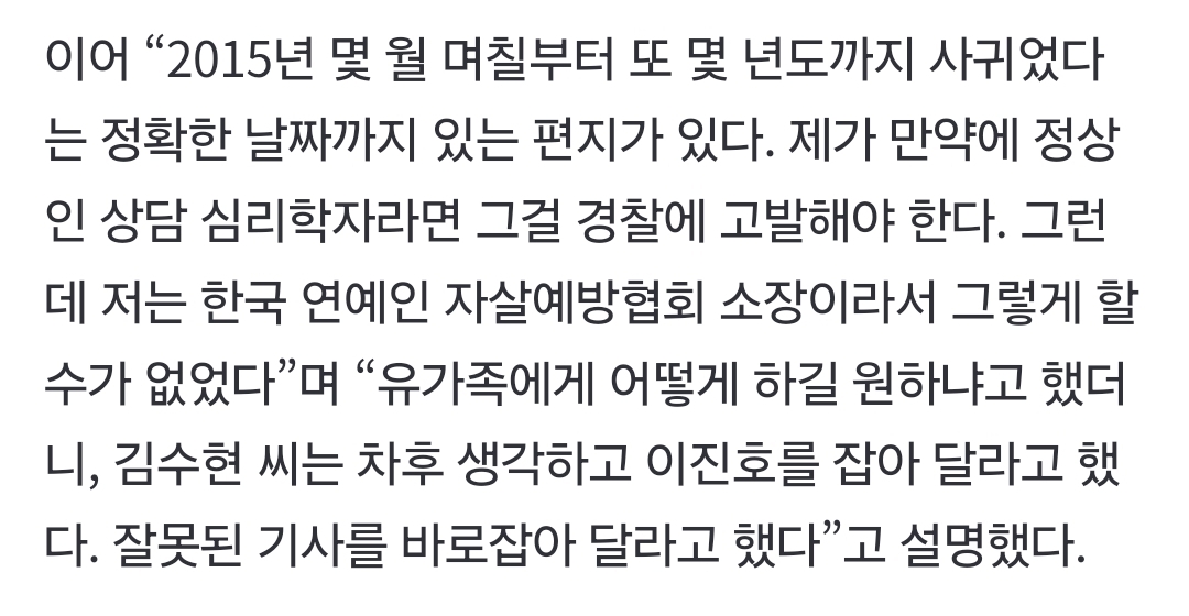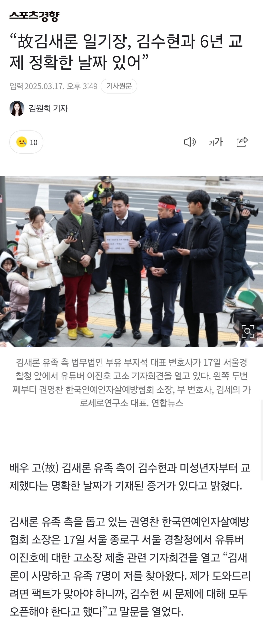 [여시뉴스데스크]“故김새론 일기장, 김수현과 6년 교제 정확한 날짜 있어” 작성자댕냥꿈꿈|작성시간25.03.17|조회수25,345 목록 댓글 25 글자크기 작게가 글자크기 크게가 출처: https://m.entertain.naver.com/article/144/0001025863 ... 전문은 출처로.. 다음검색 현재 게시글 추가 기능 열기 북마크 공유하기 신고 센터로 신고 댓글 댓글 25 댓글쓰기 답글쓰기 댓글 리스트 작성자tykizee | 작성시간 25.03.17 천벌받아 작성자뇨스바제로 | 작성시간 25.03.17 또또 이상한 헛소리 짓껄여봐 작성자익스펠리아르무스 | 작성시간 25.03.17 해외 OTT에서 위약금 꼭 물길 작성자belvv | 작성시간 25.03.17 김수현을 차후 생각….이라니 ㅠㅠ 작성자Jass | 작성시간 25.03.18 이진호 뒷배가 김파리였다매 ㅠ 걍 김파리를 잡지 댓글 전체보기