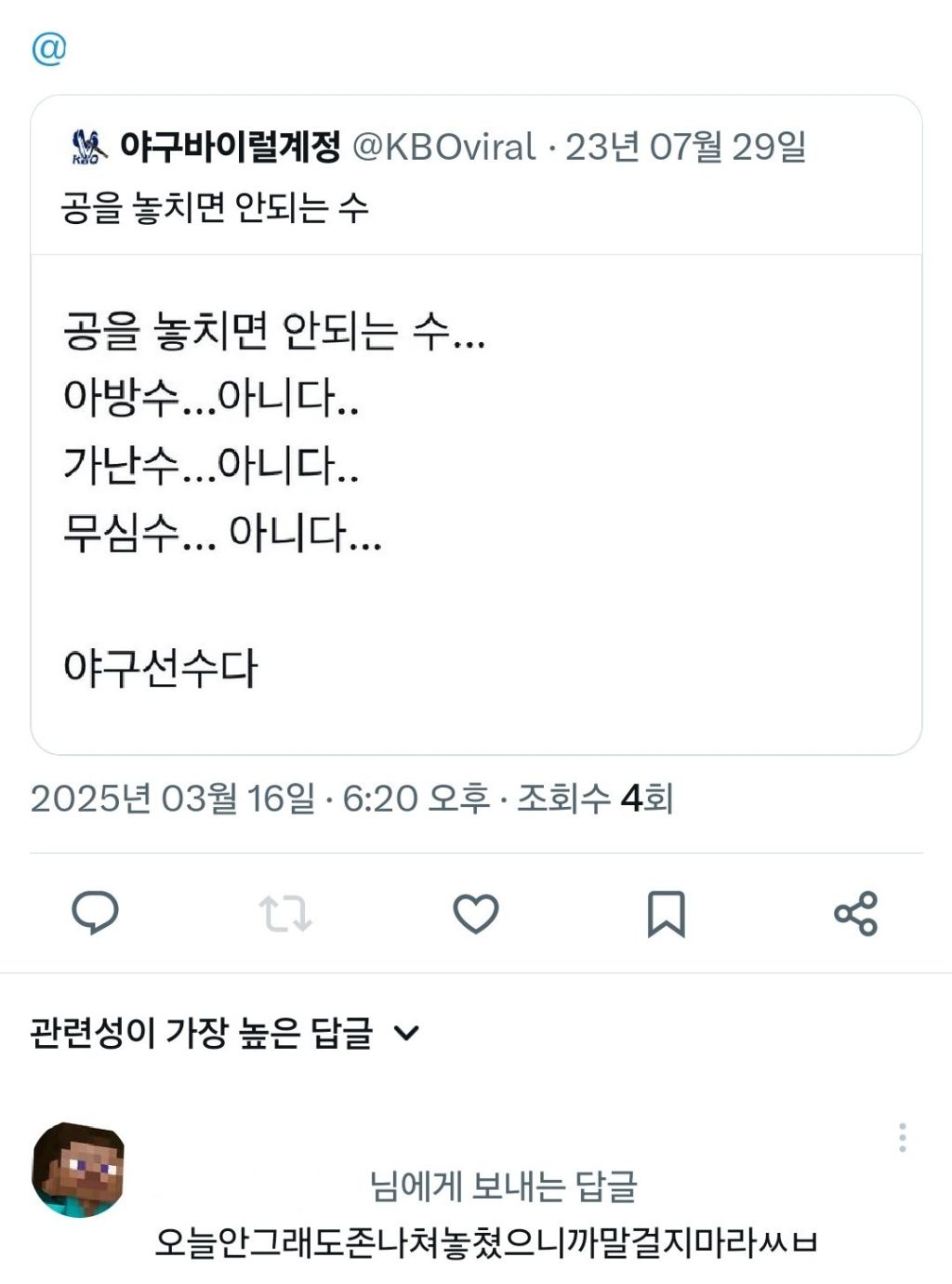 [기타]공을 놓치면 안 되는 수... 작성자만물사주충|작성시간25.03.17|조회수6,865 목록 댓글 14 글자크기 작게가 글자크기 크게가 출처: 여성시대 (본인 닉네임)https://x.com/SSUMMENN/status/1901143709175202113?t=cp40IKVrVnsfQZUYC6ETpQ&s=19 다음검색 현재 게시글 추가 기능 열기 북마크 공유하기 신고 센터로 신고 댓글 댓글 14 댓글쓰기 답글쓰기 댓글 리스트 작성자윤석열파면국힘해체 | 작성시간 25.03.17 야구선 수는 다 공도 못잡는 아방수라는 말인가요? 작성자다리미에 손데임 | 작성시간 25.03.17 작성자건강몬 | 작성시간 25.03.17 와 맛다 작성자감정적인암베사 | 작성시간 25.03.17 야구는 일공다수내요 ㄷㄷㄷ 작성자승뭉 | 작성시간 25.03.17 천하명문 댓글 전체보기