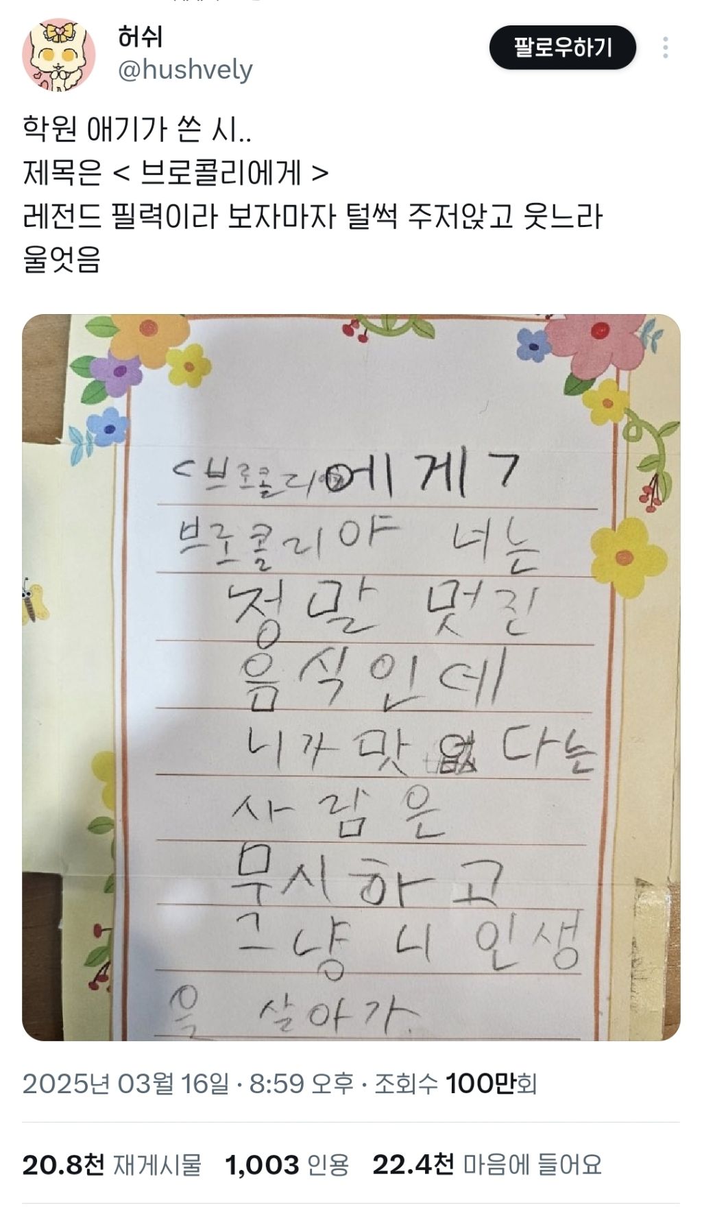 [기타]학원 애기가 쓴 시에 털썩 주저앉아 웃다 운 트위터리안.twt 작성자이굴루|작성시간25.03.17|조회수76,947 목록 댓글 34 글자크기 작게가 글자크기 크게가 출처: https://x.com/hushvely/status/1901241856983490635?s=19무시하고 그냥 니 인생을 살아가.기개 대박 다음검색 현재 게시글 추가 기능 열기 북마크 공유하기 신고 센터로 신고 댓글 댓글 34 댓글쓰기 답글쓰기 댓글 리스트 작성자니가나애대해몴알아 | 작성시간 25.03.17 아쒸 존멋이네 작성자떡소떡소떡소 | 작성시간 25.03.17 나 왜 좀 울컥해 작성자볶은 통현미 | 작성시간 25.03.17 귀엽다ㅠㅠㅋㅋㅋㅋㅋㅋㅋ 작성자김우뷘 | 작성시간 25.03.27 ㄱㅇㅇ 작성자로제네파스타 | 작성시간 25.03.28 와 너무 좋다 ㅋㅋㅋ 댓글 전체보기