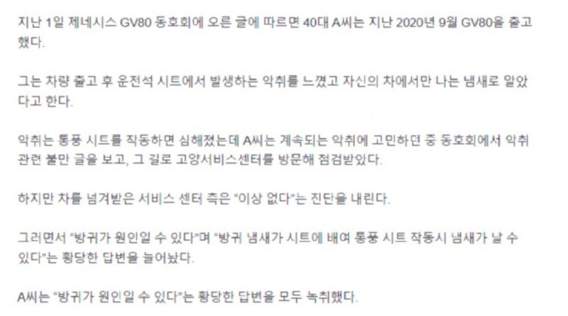 [스크랩] [흥미돋]제네시스 GV80 통풍시트서 원인 모를 악취... 현대차 "방귀 뀌어서 그럴 수 있다" 주장 작성자거위와고양이|작성시간25.03.17|조회수19,444 목록 댓글 48 글자크기 작게가 글자크기 크게가 "방귀가 원인일 수 있다" ㅋㅋㅋㅋㅋㅋㅋㅋ 다음검색 스크랩 원문 : 이종격투기 현재 게시글 추가 기능 열기 북마크 공유하기 신고 센터로 신고 댓글 댓글 48 댓글쓰기 답글쓰기 댓글 리스트 작성자온순한툥후이 | 작성시간 25.03.17 ㅋㅋㅋㅋㅋㅋ 작성자우린축제를하고항상숙제를미뤘던 | 작성시간 25.03.17 ㅋㅋㅋㅋㅋㅋㅋㅋㅋㅋㅋㅋㅋㅋㅋㅋㅋ=333 작성자100억자산가 | 작성시간 25.03.17 뿡V80ㅠㅠ 작성자될사람! | 작성시간 25.03.18 ㅠㅠㅋㅋㅋㅋ 작성자국민의힘 지역구에서 소비X 불매 | 작성시간 25.03.18 ㅋㅋㅋㅋㅋㅋㅋㅋㅋㅋㅋㅋㅋㅋㅋ냄새나는 차와 수치심을 가지게 된 차주... 댓글 전체보기