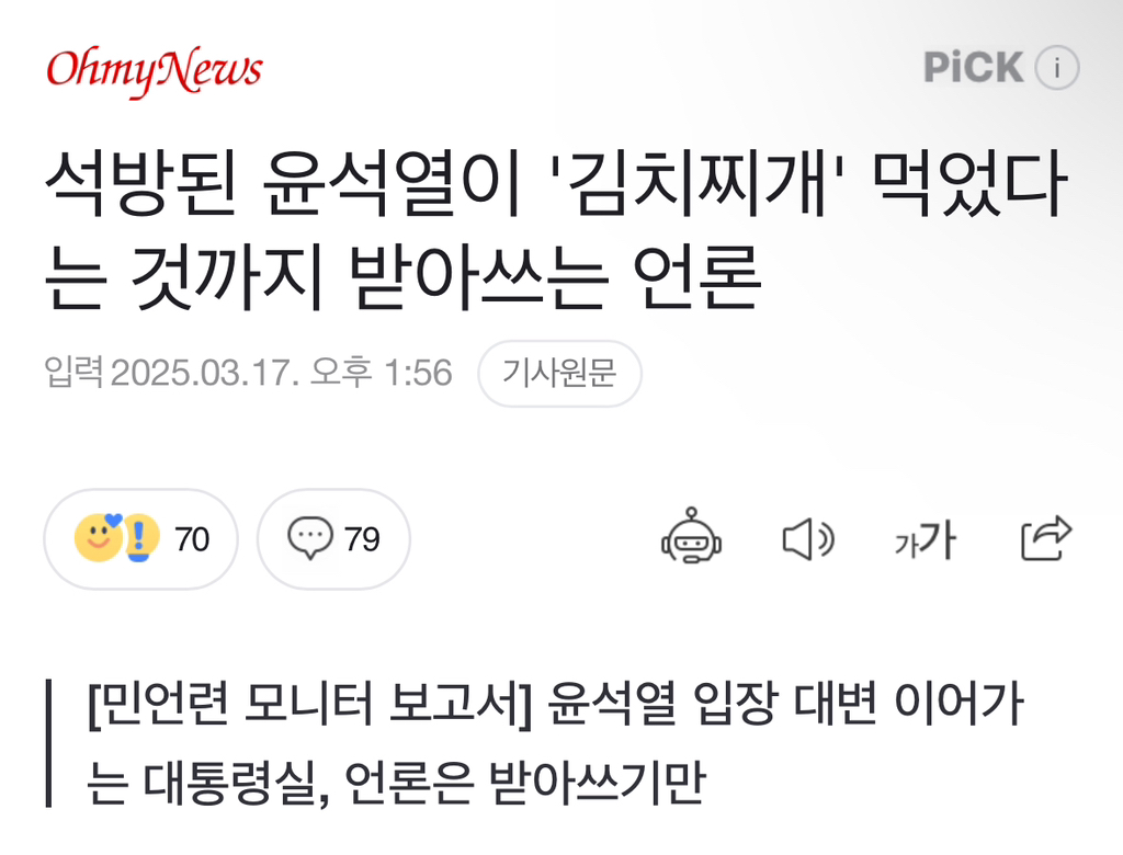 [여시뉴스데스크]석방된 윤석열이 '김치찌개' 먹었다는 것까지 받아쓰는 언론 작성자소리앙|작성시간25.03.17|조회수1,159 목록 댓글 3 글자크기 작게가 글자크기 크게가 출처: https://naver.me/GtU08P2G석방된 윤석열이 '김치찌개' 먹었다는 것까지 받아쓰는 언론▲ 서울구치소 앞 지지자들에게 인사하는 윤석열 대통령 석방된 윤석열 대통령이 8일 경기도 의왕시 서울구치소 앞에서 경호차량에서 내려 지지자들에게 인사하고 있다. ⓒ 연합뉴스 서울중앙n.news.naver.com전문출처 다음검색 현재 게시글 추가 기능 열기 북마크 공유하기 신고 센터로 신고 댓글 댓글 3 댓글쓰기 답글쓰기 댓글 리스트 작성자리치영앤부자 | 작성시간 25.03.17 언론이냐 스레기냐 작성자뿌리린 | 작성시간 25.03.17 씹쌔 그와중에 친일파후손이 먹기는 김치찌개 쳐먹고 지랄 작성자at last | 작성시간 25.03.17 쓰레기들임 진짜 댓글 전체보기