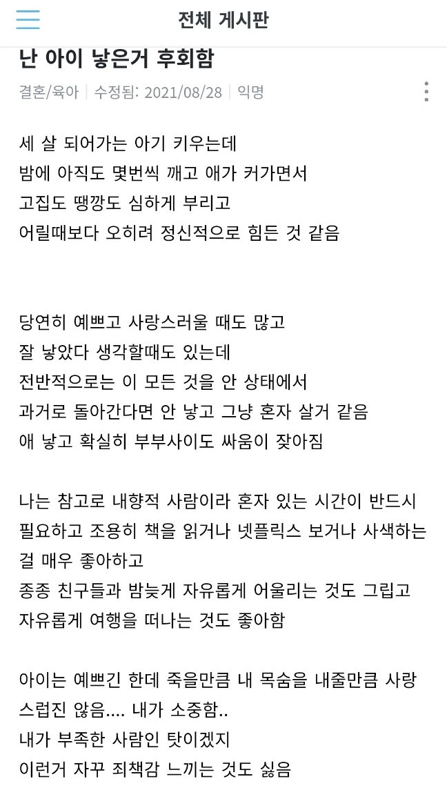 작성자코코아매쓰 작성시간 25.03.18 엄마라고 애보면 무조건 행복해야하고 희생해야하고 그런것도 아니잖아 책임감만있음되지 난 내엄마가 나 낳고 후회했었다고해도 ㄱㅊ음 그럴수도있지.. 사람은 행동에따라 평가받는거지 하나하나 감정까지 검열받아야하나