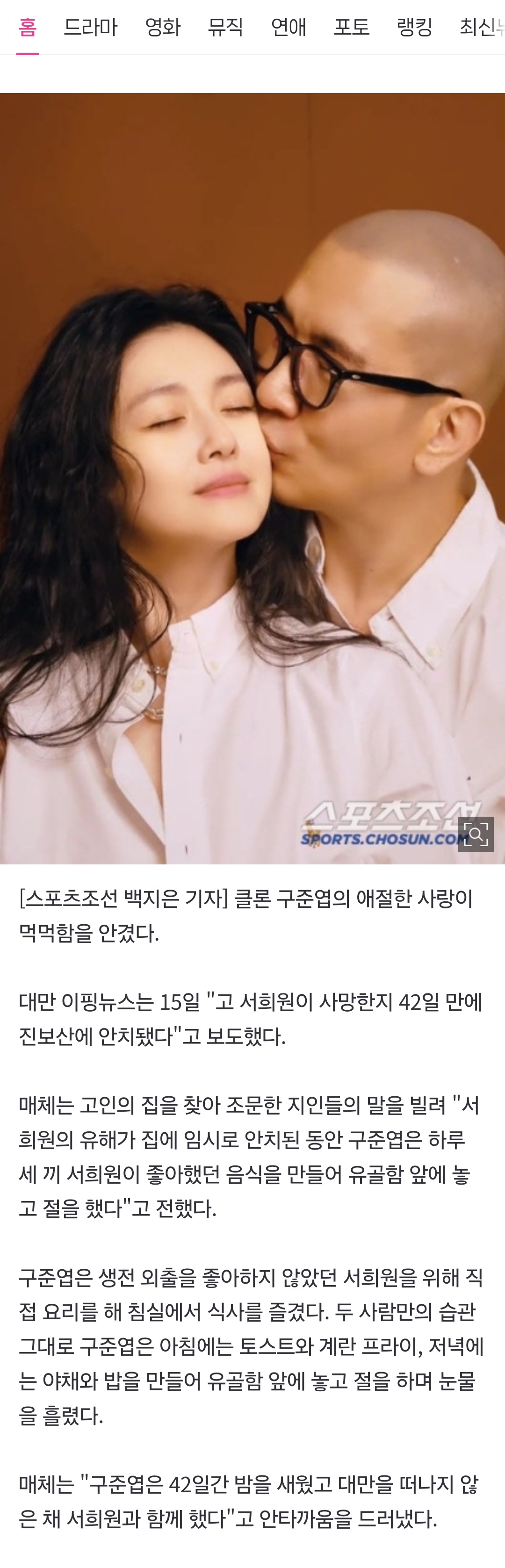 [여시뉴스데스크]"구준엽, 매일 故 서희원 좋아했던 요리해 제사 지내"…하늘도 울린 사랑[SC이슈] 작성자보끼|작성시간25.03.17|조회수69,681 목록 댓글 42 글자크기 작게가 글자크기 크게가 출처: https://m.entertain.naver.com/article/076/0004254893 다음검색 현재 게시글 추가 기능 열기 북마크 공유하기 신고 센터로 신고 댓글 댓글 42 댓글쓰기 답글쓰기 댓글 리스트 작성자채소한바가지 | 작성시간 25.03.18 삼촌 너무 가엽음… ㅠㅠ불쌍해 작성자따봉재슥아이번주로또일등을부탁해 | 작성시간 25.03.18 힘내시길.. 작성자브리트니점레 | 작성시간 25.03.18 어휴.... 작성자리딩시크릿 | 작성시간 25.03.18 ㅠㅠ 작성자강냉이조심햐 | 작성시간 25.03.19 저 마음이 가늠이 안가 너무 슬퍼 댓글 전체보기