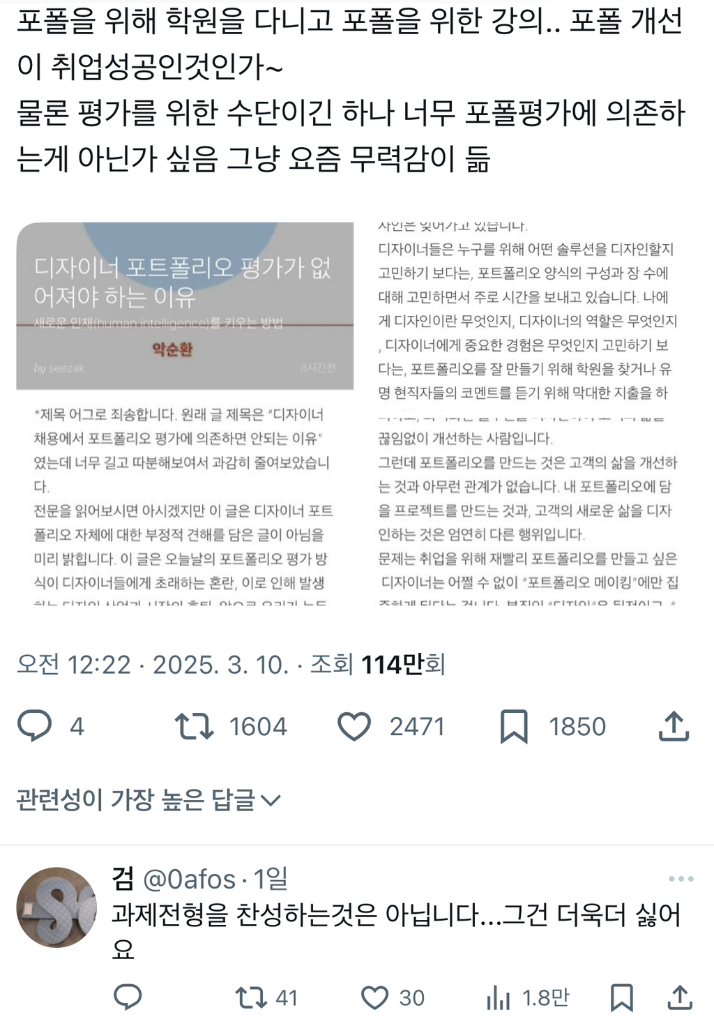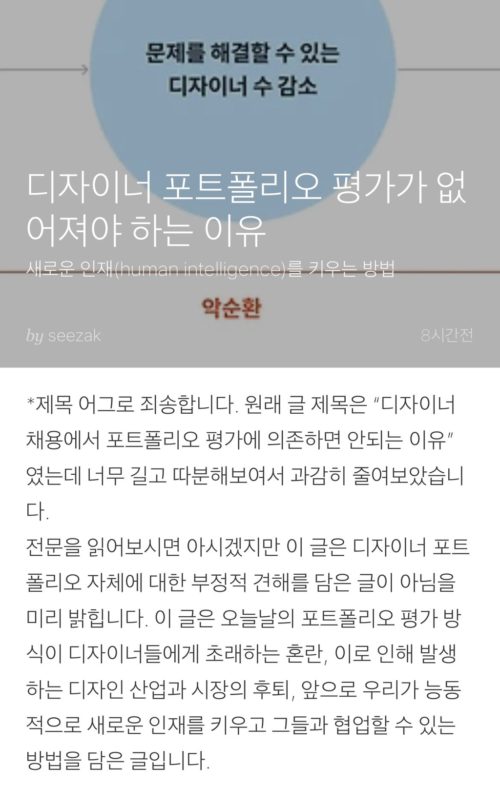 작성자랭노랭 작성시간 25.03.18 전혀 다른 분야 디자인 하다가 다른 쪽 디자인 포폴 만드려고 보는데 사람들 포폴이 다 똑같은데 다 잘했어.. 시작할 엄두도안나게