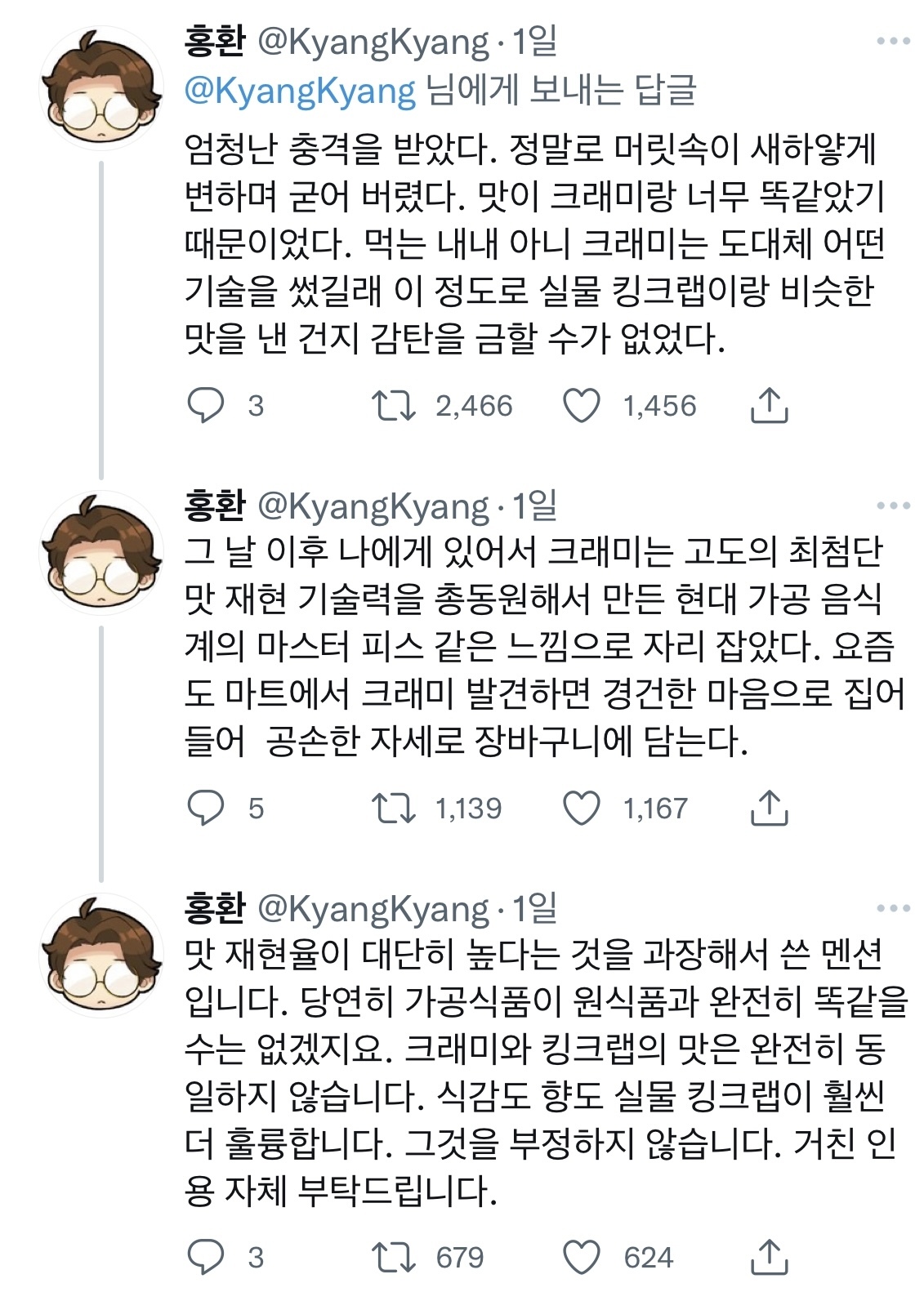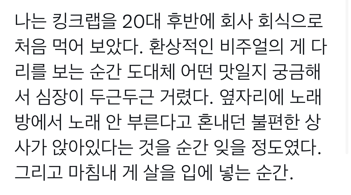 작성자설탕왕감자 작성시간 25.03.18 갑각류 알러지가 갑자기 생겨 킹크랩을 먹어보기 전 저주받은 몸뚱이가 되어… 이 글 보며 늘 크래미 사옴.. oO(식품영양학 석박사들의 마스터피스… 재현률 쌉쌉쌉…)