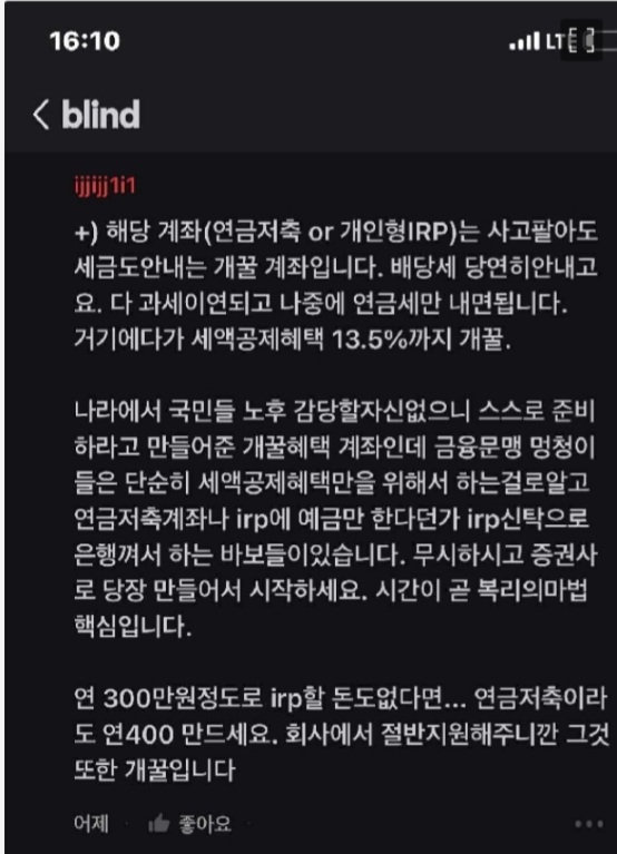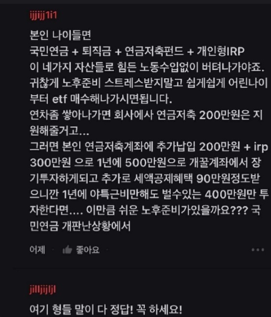 [스크랩] [흥미돋]직장인들 안하면 호구라는 연금저축펀드 + (irp/etf) 작성자콜라한입|작성시간25.03.18|조회수23,269 목록 댓글 43 글자크기 작게가 글자크기 크게가 출처 : 여성시대 내가가는길이곡길이다최근에 블라에서 핫플난 안하면호구인것들...의 댓에서 본 캡쳐...내가 그 호구라 이제라도 하려는데 어려워서 여시들 댓글 보려고 직접 올리는 글 😙 다음검색 스크랩 원문 : *여성시대* 차분한 20대들의 알흠다운 공간 현재 게시글 추가 기능 열기 북마크 공유하기 신고 센터로 신고 댓글 댓글 43 댓글쓰기 답글쓰기 댓글 리스트 작성자bicjsjq | 작성시간 25.03.18 나는 집부터 사는게 목표인데 연저펀은 안드는게 낫겠지 아직, 우선 ISA만 3년들고? 작성자이우현 | 작성시간 25.03.18 어느정도 소득 있는 사람한테 추천... 소득 적을때는 절세효과도 별로 없고 괜히 돈 묶여 작성자나무낙원 | 작성시간 25.03.18 돈이 없어요 작성자깡깡징어 | 작성시간 25.03.18 취업하면 알아보고 해야겠다.. 작성자피키 블라인더스 | 작성시간 25.06.17 댓글 많이 알아갑니댜.. 댓글 전체보기