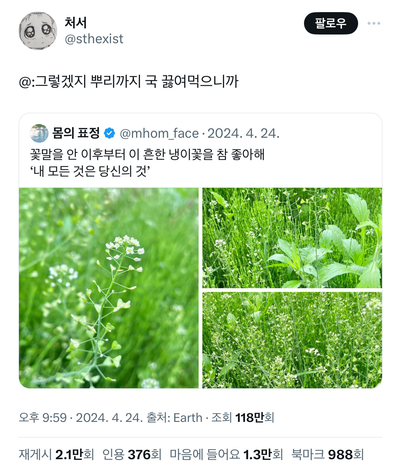[흥미돋]꽃말을 안 이후부터 냉이꽃을 참 좋아해 작성자나프탈렌향|작성시간25.03.18|조회수38,850 목록 댓글 38 글자크기 작게가 글자크기 크게가 출처: https://x.com/sthexist/status/1783118572371456063?s=46&t=v7QMmEln8v7WsADFKYn65g 다음검색 현재 게시글 추가 기능 열기 북마크 공유하기 신고 센터로 신고 댓글 댓글 38 댓글쓰기 답글쓰기 댓글 리스트 작성자말티즈는사랑입니당 | 작성시간 25.03.18 냉이무침 냉이전 냉이된장찌개 작성자3의 2 | 작성시간 25.03.18 냉이 존맛 작성자쇠망치 | 작성시간 25.03.18 냉이 넣은 떡볶이 땡겨 작성자화 없는 여시 | 작성시간 25.03.18 저 꽃이 냉이었어?! 작성자나 로또1등 된다 | 작성시간 25.03.18 ㅋㅋㅋㅋㅋㅋㅋㅋㅋㅋㅋ 댓글 전체보기