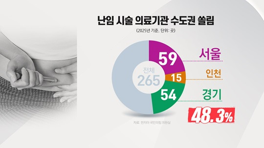 난임 병원의 수도권 쏠림 현상도 크게 나타났습니다. 서울, 경기, 인천에 총 128곳이 위치해 있어 전국 265곳 가운데 48.3%를 차지했습니다. 난임 시술 의료기관이 가장 적은 곳은 세종시(1곳)였고 전남과 울산(각 5곳), 제주(6곳)가 뒤를 이었습니다.