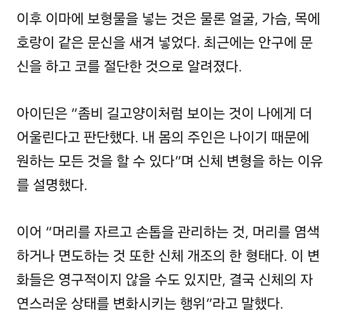 작성자석류와 인디고 작성시간 25.03.19 신체개조 저렇게까지 가는 사람 중에 진짜 좋아서 진짜 추구해서 하는 사람 몇 안 될 것 같아