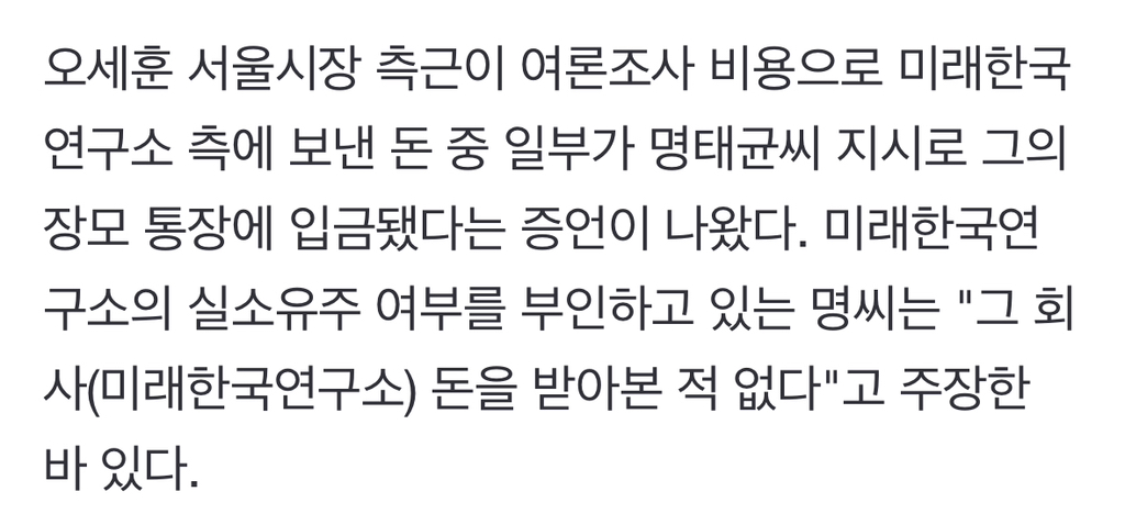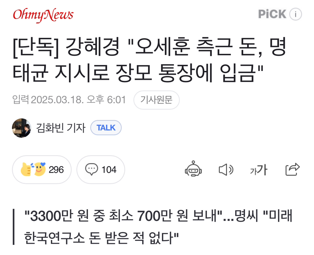 [여시뉴스데스크][단독] 강혜경 "오세훈 측근 돈, 명태균 지시로 장모 통장에 입금" 작성자소리앙|작성시간25.03.19|조회수1,009 목록 댓글 6 글자크기 작게가 글자크기 크게가 출처: https://naver.me/F2Z36Kvn[단독] 강혜경 "오세훈 측근 돈, 명태균 지시로 장모 통장에 입금"▲ 명태균과 오세훈 서울시장 ⓒ 사진출처:명태균페이스북, 서울시 홈페이지 오세훈 서울시장 측근이 여론조사 비용으로 미래한국연구소 측에 보낸 돈 중 일부가 명태균씨 지시로 그의 장모 통n.news.naver.com전문출처 다음검색 현재 게시글 추가 기능 열기 북마크 공유하기 신고 센터로 신고 댓글 댓글 6 댓글쓰기 답글쓰기 댓글 리스트 답댓글 작성자큭피 | 작성시간 25.03.19 근데 저분 나올때마다 안위가 너무 걱정된다... 안전하게 계시는거 맞겠지 작성자눈송별 | 작성시간 25.03.19 가지가지 하는구나 작성자바쩡아의나라 | 작성시간 25.03.19 임마는 왜 조용한거야 작성자가벼운공 | 작성시간 25.03.19 오세훈은 뭐가 이렇게 당당한거야? 작성자주말좋아 | 작성시간 25.03.19 오세훈도 정치 생명 끝내야하는데 댓글 전체보기