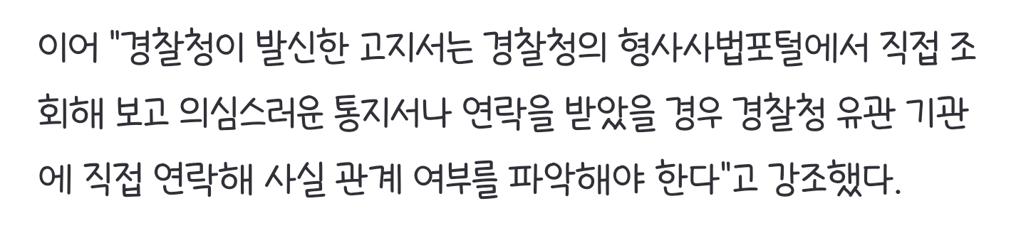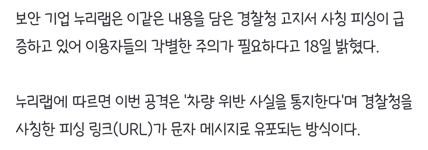[여시뉴스데스크]"신호위반 과태료 고지서입니다"…경찰청 문자통지 알고보니 작성자너너뉘기야|작성시간25.03.19|조회수1,880 목록 댓글 1 글자크기 작게가 글자크기 크게가 출처: https://naver.me/GtU0ekVj"신호위반 과태료 고지서입니다"…경찰청 문자통지 알고보니#차량 신호위반 처벌 고지서 발송 완료 보안 기업 누리랩은 이같은 내용을 담은 경찰청 고지서 사칭 피싱이 급증하고 있어 이용자들의 각별한 주의가 필요하다고 18일 밝혔다. 누리랩에 따르면 n.news.naver.com• • • 다음검색 현재 게시글 추가 기능 열기 북마크 공유하기 신고 센터로 신고 댓글 댓글 1 댓글쓰기 답글쓰기 댓글 리스트 작성자새의선물 | 작성시간 25.03.19 교통민원 24에서 위반 사례 조회 할 수 있음 그리고 위반해도 문자로 절대 않오고 고지서 날라옴 다들 속지마세요 ~~ 댓글 전체보기