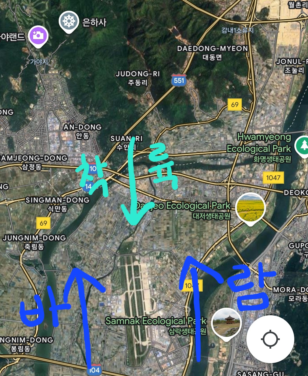 이렇게 남풍이 불면, 비행기는 신어산쪽에서 접근해서 북➡️남 방향으로 착륙을 해야한다는 소리다.